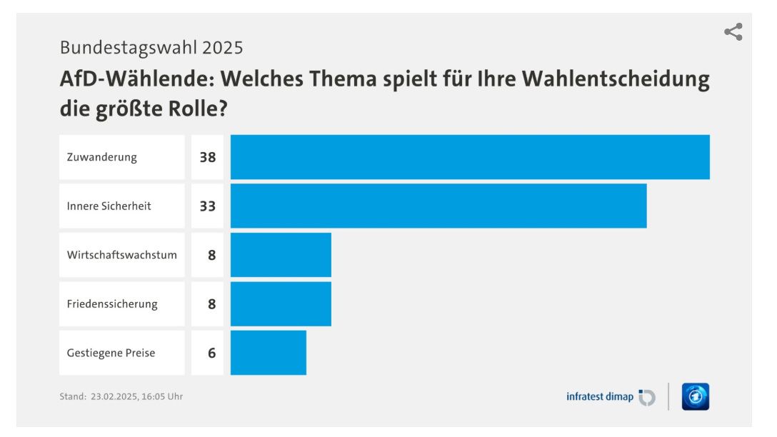 But even if AfD voters are economically and socially stressed, inflation simply was not the key issue in this election. For AfD voters migration was six times more important and internal security five times more important.