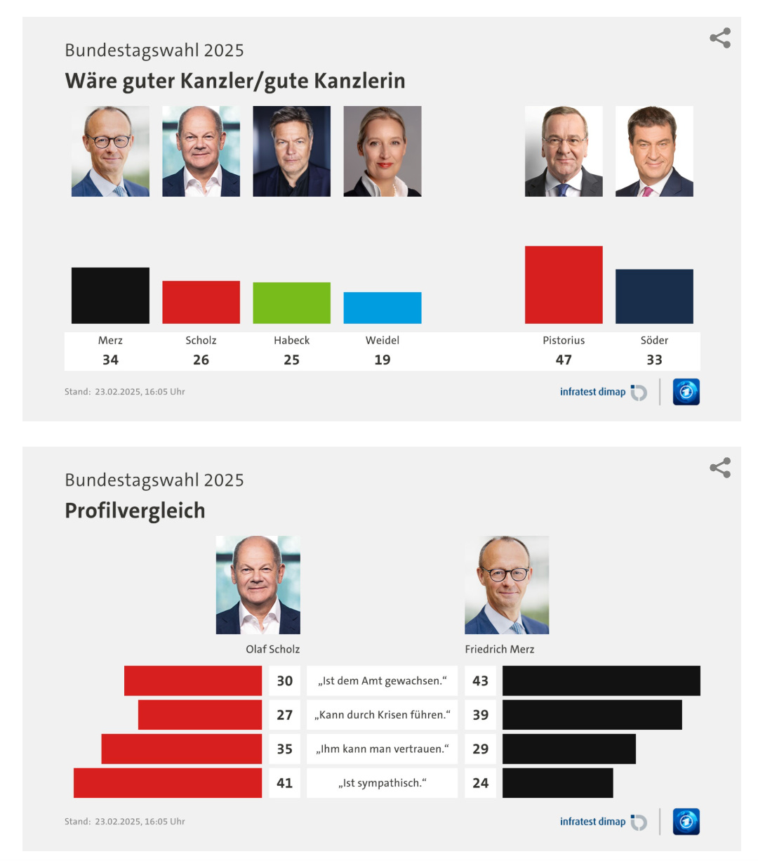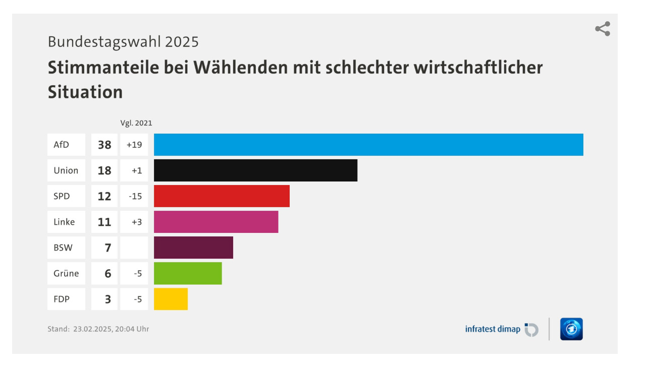 From looking at the election result we notice, that immiseration in Germany has progressed and that the country has been successfully transformed into a low trust society. And yes, if we look at eg., the Edelman Trust Barometer in 2021 still 53% had general trust in the countries institutions, a figure now reduced to 41%, which is below eg., Kenya, Mexico and Colombia. Countries with increasing poverty, social problems and decreasing trust vote "right". Left governments are usually the outcome of harmonious high trust societies, as they could be found in Scandinavia.