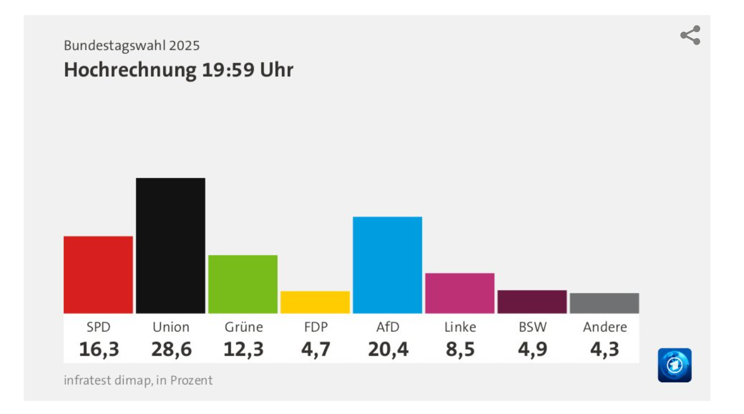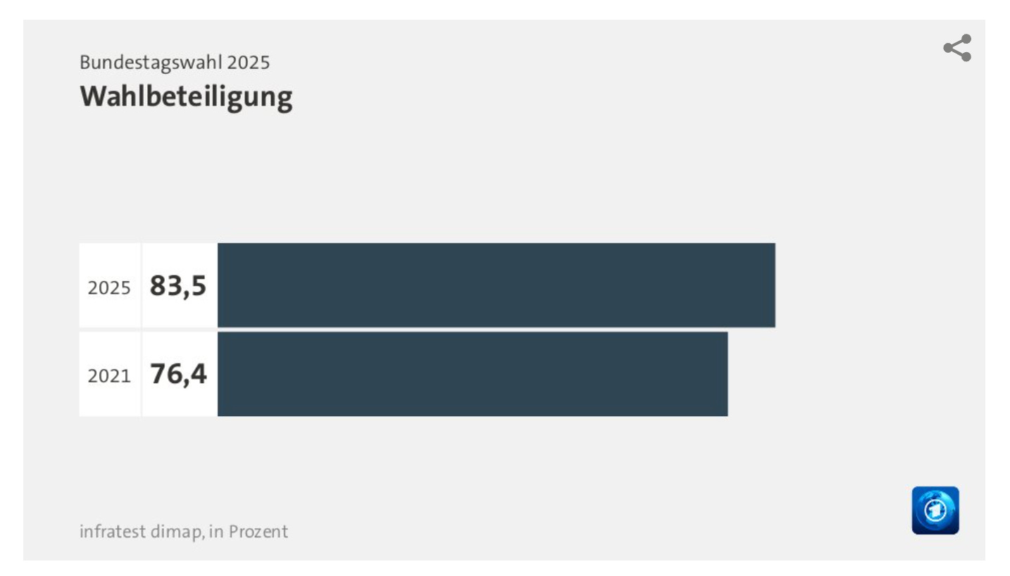 The Phoenix from the Ashes prize goes to the left, which rated just above 3% a few months ago and rose to indeed surprising 8.8%. Kudos goes to their leader Heidi Reichinnek who saved her mob with a few great speeches. Hers is the strongest party in the 18-29 age segment, which however is only 13.3% of the eligible voters, with probably a high degree of people with "migration background"; AfD his not far behind there. Bod Dylan got a Literature Nobel for his songs, maybe she gets one for her unpretentious rhetoric in parliament.