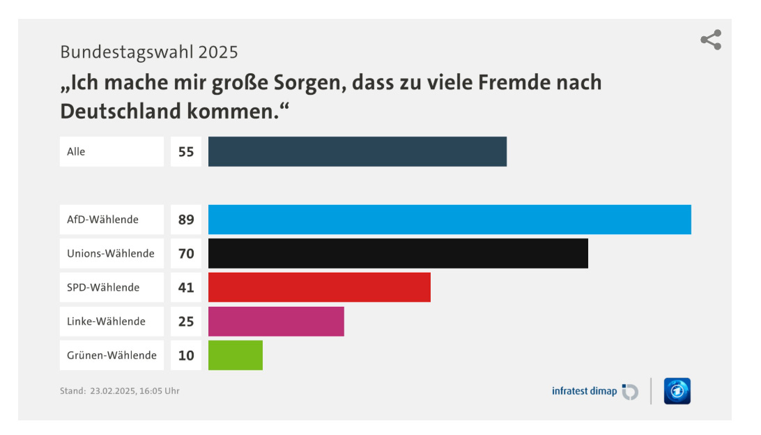 Many Germans are concerned about the scale of migration. This is true for 89 percent of AfD voters and 70 percent of Merz’s CDU following. All told, migration is a concern for 55 percent of German voters. It was undoubtedly the most contentious issue of this election.