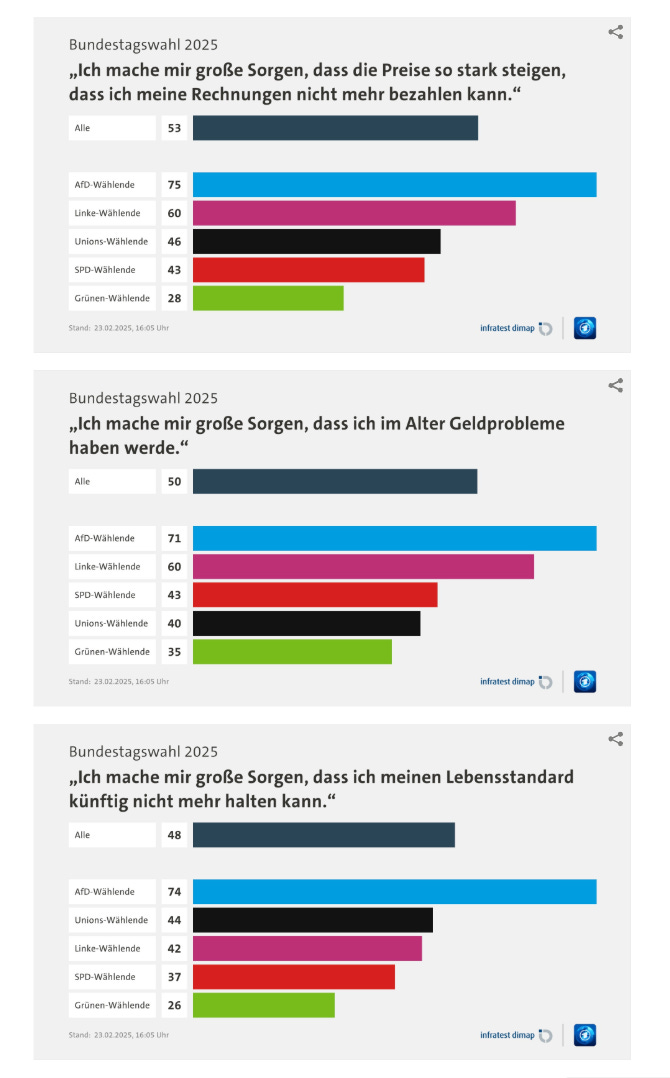 And, at the personal level, AfD voters are most worried that prices are rising so fast that they cannot pay their bills (Top panel: 75%). They worry that they will face money problems in old age (Middle panel: 71%). AfD voters also worry that they will not be able to maintain their standard of living (Bottom panel: 74%).