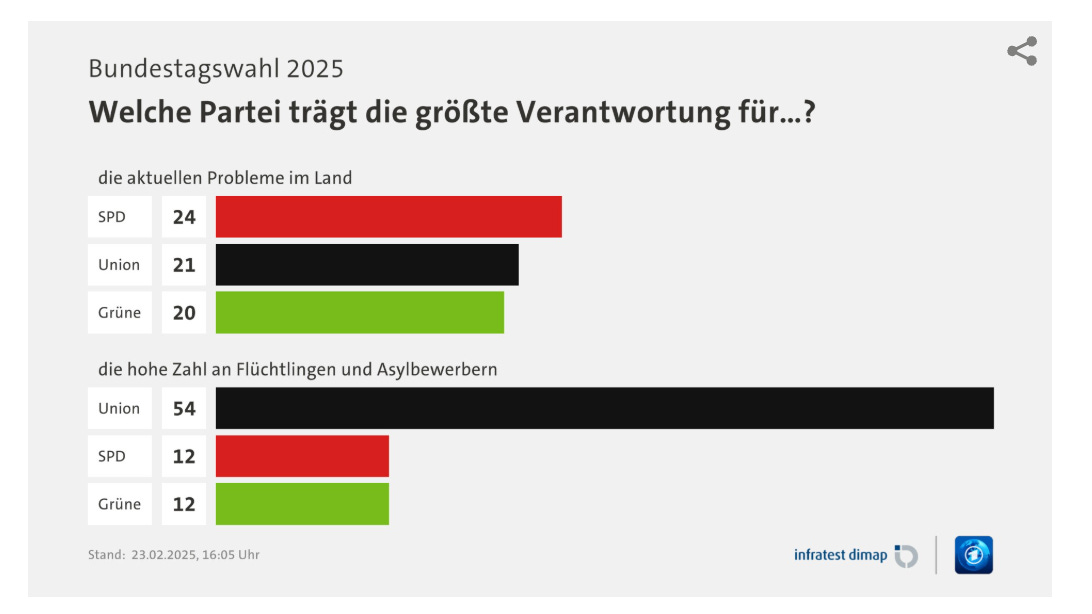 Translation: Which party has most responsibility for …? (top: the current problems of the country; below: the large number of refugees and asylum seekers.)