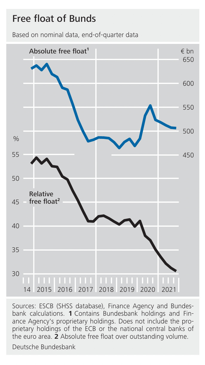 Germany has by far the lowest debt to gdp ratio of any large economy. Unsurprisingly fiscal restraint at this level has gone hand in hand with low levels of public investment and a general macroeconomic. imbalance that leaves Germany heavily dependent on foreign demand. Meanwhile German public debts available for public purchase - “free float” - became increasingly scarce, a squeeze compounded by the asset purchases of the ECB.
