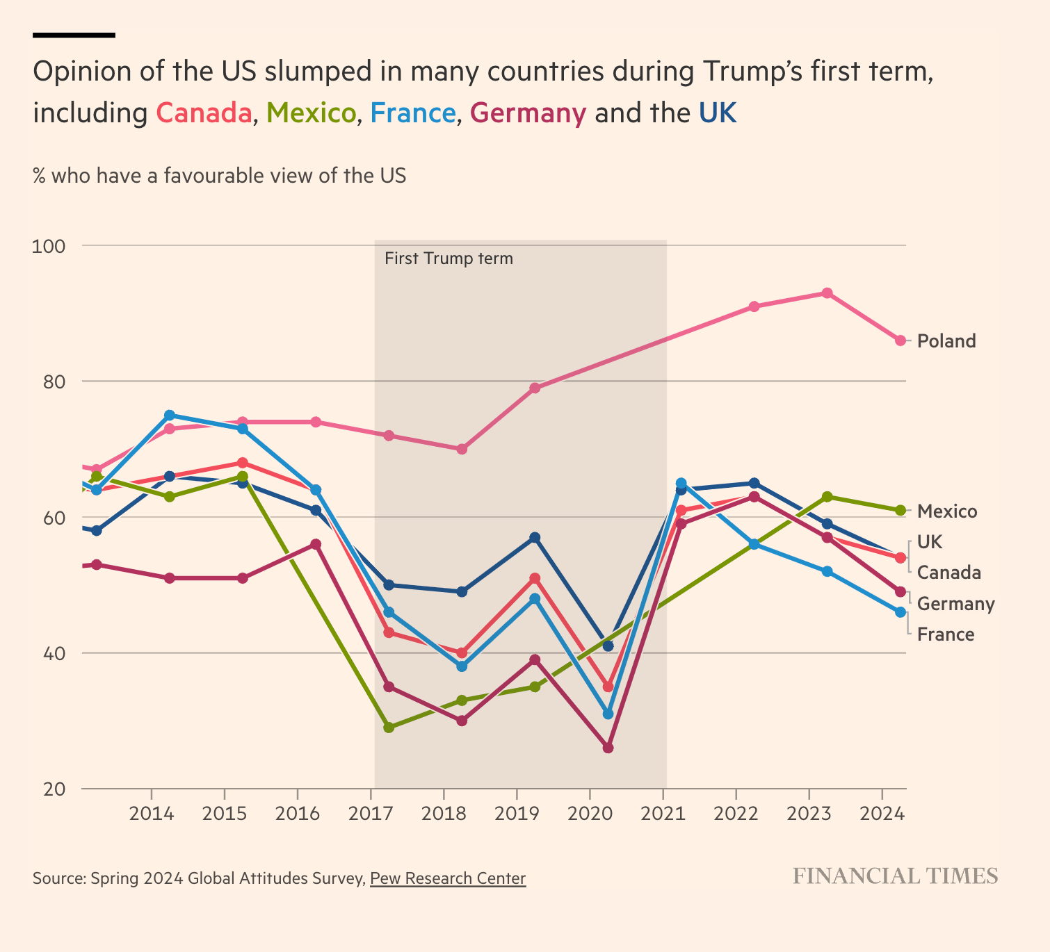 The long read in the FT this weekend under the title “Trump and the end of American soft power” is by one of the true doyens of US foreign policy thinking, Joseph Nye. Back in 1990 Nye popularized the idea of “soft power” to characterize the way that countries influence each other by means other than “hard power”. Unsurprisingly, he sees Trump’s “exclusive nationalism” as a losing strategy. Nye concludes that “American soft power will have a hard time during the next four years”. But he stops short of making any wider diagnosis.