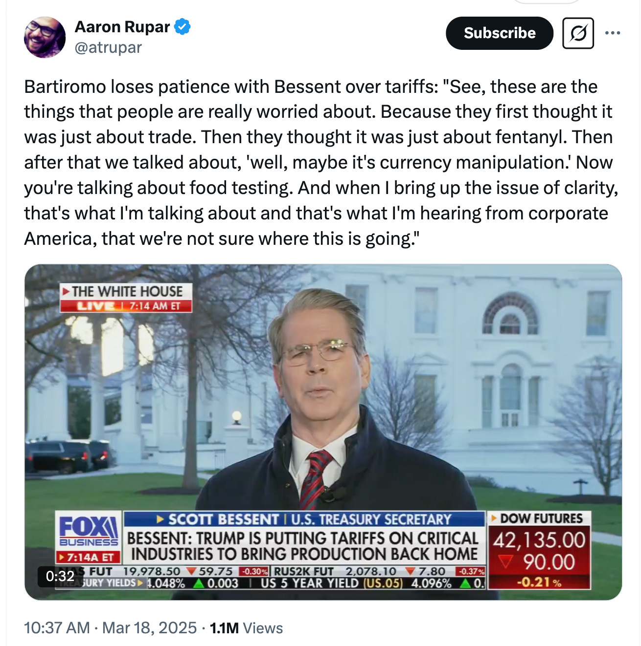 Trump is tariff man. Tariff is the most beautiful word in the english language. The boss wants tariffs. You deliver tariffs on something and someone and for whatever reason. The rest is noise.