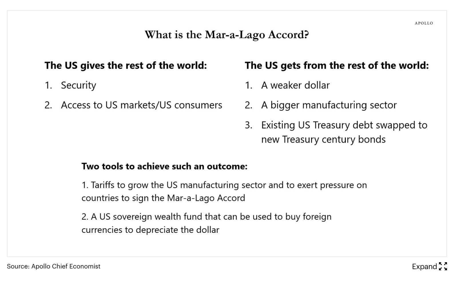 These newly minted dollars could buy bitcoin, fund a sovereign wealth fund, or be used by Treasury for other purposes. “This would insulate the US balance sheet to a dollar depreciation. Hence, a Mar-A-Largo Accord aimed at weakening the US dollar would be shared with foreign creditors, a pill they would swallow with hopes and expectations of playing a stronger role in the future monetary system.”