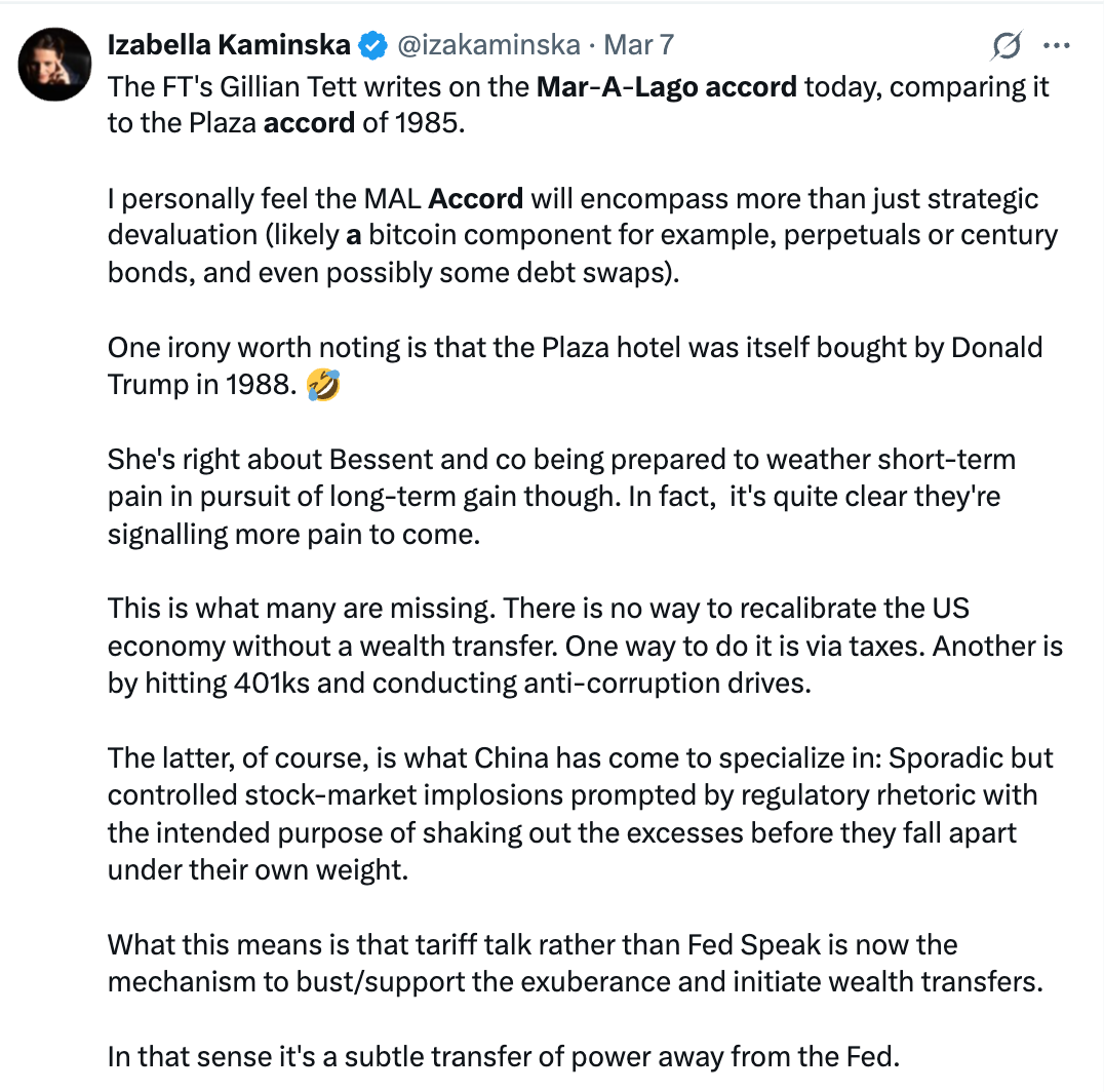 In a characteristically gothic tweet, Izabella Kaminska imagines that chatter about the Mar-a-Lago accord and the market “correction” that this is likely to provoke, is the outward sign of the Trump administration playing 5-dimensional chess. The shock to investors delivered by all the loose talk about tariffs and currencies is deliberate. It is a means to achieve the same effect as Beijing’s rougher regulatory interventions in Chinese markets: One off adjustments of wealth claims. Under Trump team Mar-a-Lago replaces Powell and the Fed as the main lever of financial power.