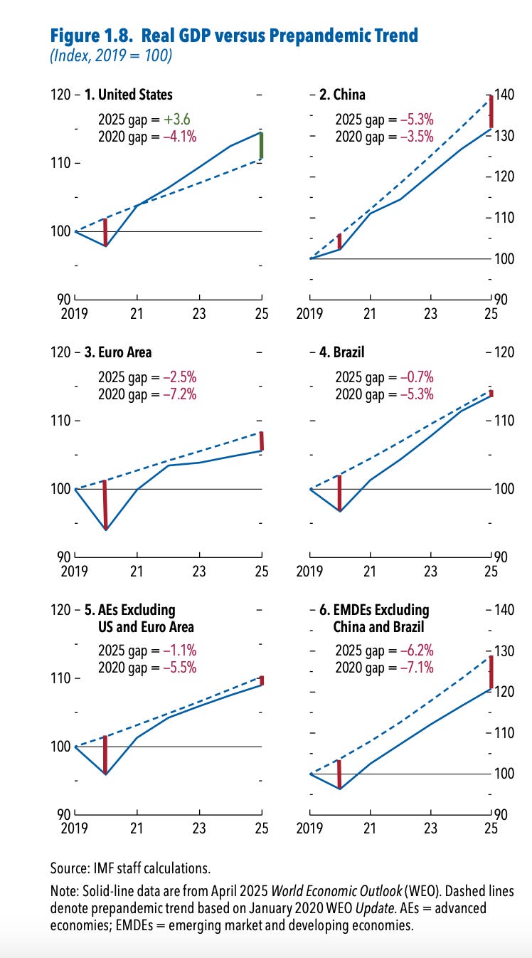 The economic experience of the “Emerging-market and Developing Economies other than China and Brazil” has been distinctive. They were shocked off their pre-2020 growth trend by COVID and have not returned to that growth trend. But despite this shock, their pre-COVID growth trend has not dramatically slowed, certainly not to the degree seen in Europe and China. This means that though their growth is relatively rapid, the gap between GDP in 2024 and the pre-COVID trajectory has remained at 6 percent. If we take global GDP to have been around $110 trillion in 2024 the loss amounts to c. $2.5 trillion, a unit roughly the size of the economy of Italy.