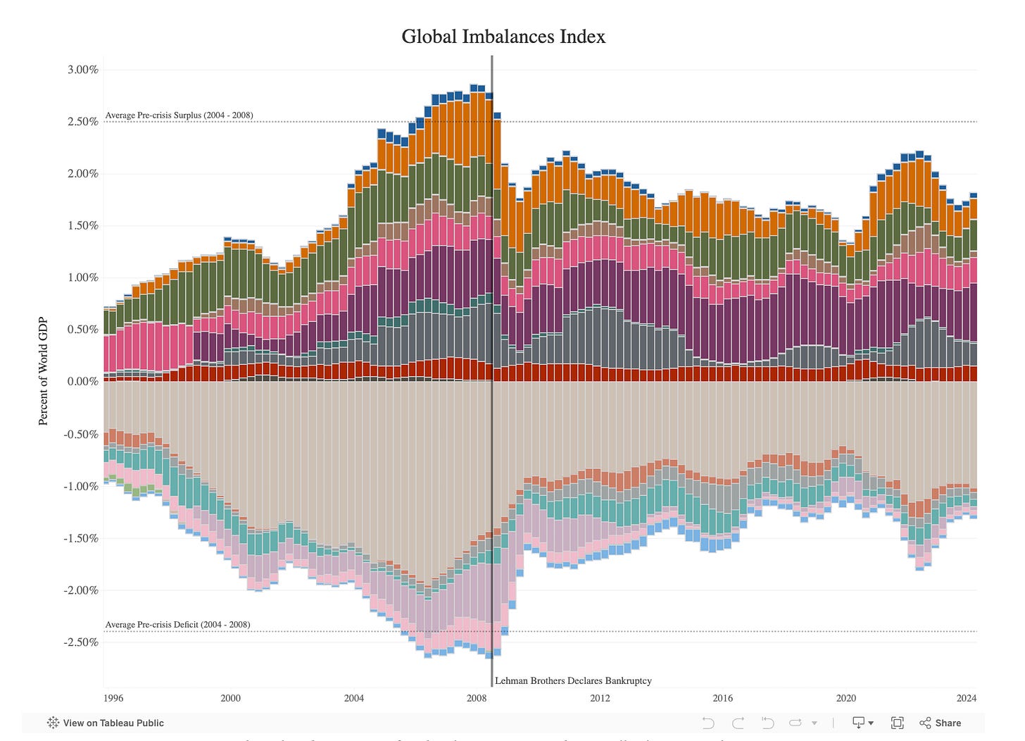 The statistics for global imbalances in the figure below are the same as those in the graph above, also prepared by the Council of Foreign Relations (CFR) in New York, but now scaled to global GDP.
