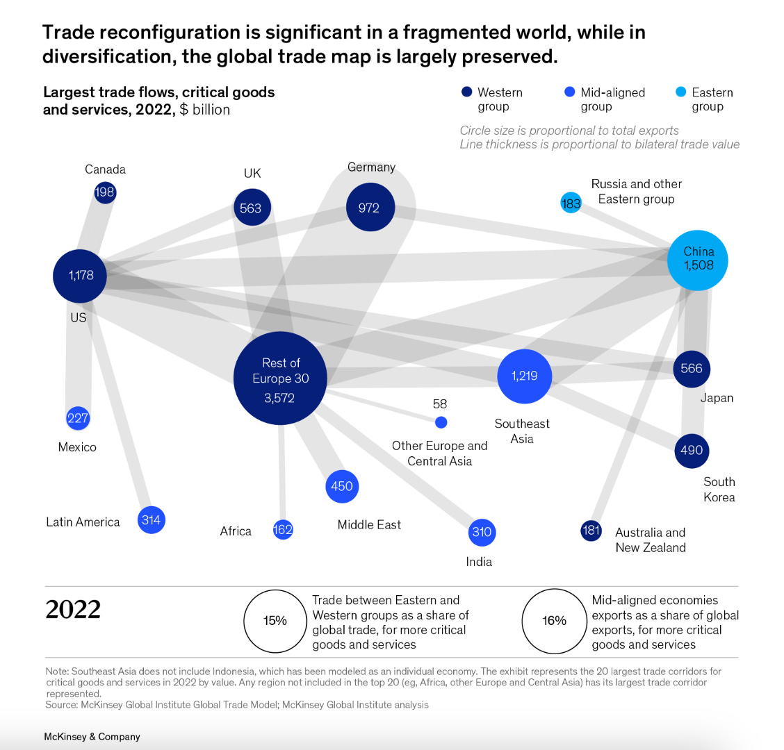 If you change the optic and focus on the overall flow of goods, whether through mapping imports or exports, world trade appears not as a one-way flow to America, but as a multipolar network of which the US is a significant but by no means dominant part. Here, for instance is an impressive graphic from MGI, with overall flows in grey and exports of “critical goods” quantified in the bubbles.