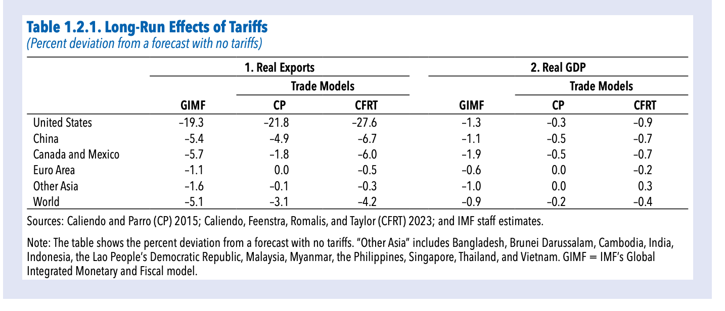 These numbers help us understand why the estimates by the IMF and other forecasters of the likely impact of a full-blown trade war are as modest as they are. The figures below are percentage point deviations from a baseline scenario with no Trump craziness.