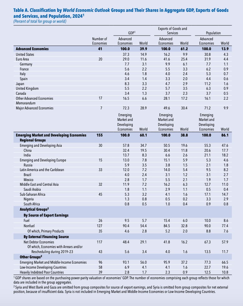 The group of Emerging-market and Developing Economies other than China and Brazil account for 38.2 percent of the world economy in PPP terms. In population terms, this group, which includes all of Africa and South Asia, accounts for 65 percent of the world’s population. One might reasonably take this group as representative of what is sometimes called “the Global South”. It contains within it a hugely diverse group of countries and regions including India with 8.3 percent of global GDP (PPP) and 18.2 percent of population and Sub-Saharan Africa with 3.2 percent of global GDP in PPP terms and 14.7 percent of population.