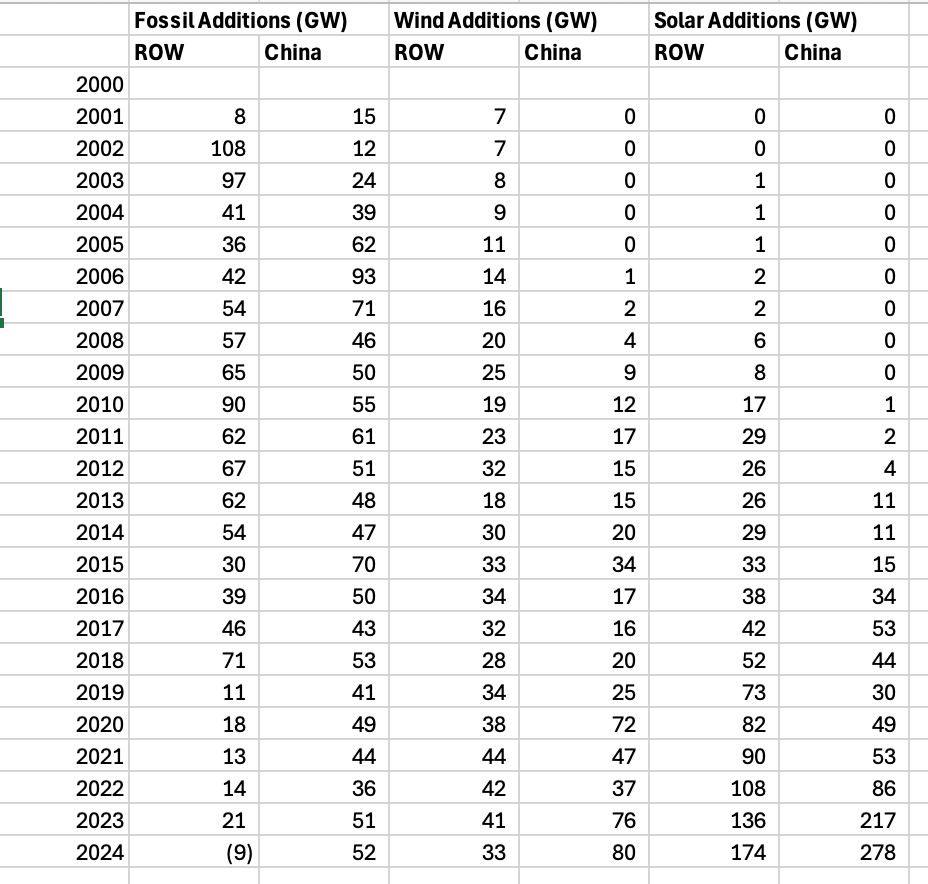Veiled in regional comparisons this fact is coyly admitted by IRENA in its highlights briefing. If you dig into the underlying data, it screams out loud. In Table 1 below, I have juxtaposed year on year additions to capacity for fossil, wind and solar for China and the Rest of the World ex-China.