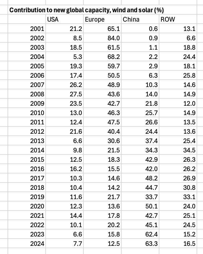The three phases can be delineated in terms of the balance between Europe, China, the ROW and the USA, shown in Table 2. The metric I am using is the regional share in annual new additions to global wind and solar capacity - a simple measure of the extent to which each region is “driving” the global transition.