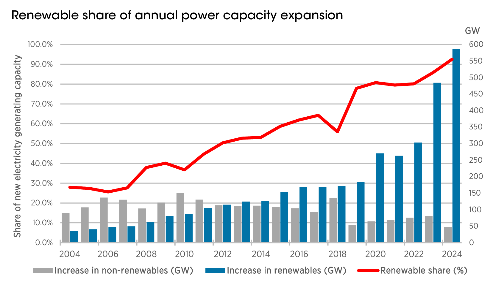 In 2024, according to the IRENA data, new additions of renewables dwarfed fossil additions by a factor of almost twenty. Yes! You read that correctly. The disparity really is that large. The renewable share of new capacity additions in electricity generation worldwide is 90 percent. As far as new capacity is concerned, the transition to solar and wind is a more or less accomplished fact.