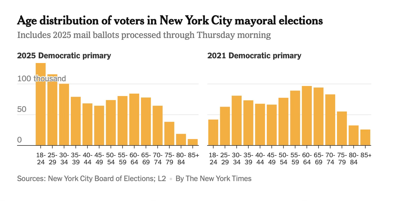 The result was to induce an improbable skew in the Democratic Primary electorate towards younger voters. This is the opposite of the normal profile, which is normally dominated by older voters. This time was different. Roughly three times as many 18-24 year olds voted in 2025 compared to 2021, making them by far the largest group of voters.
