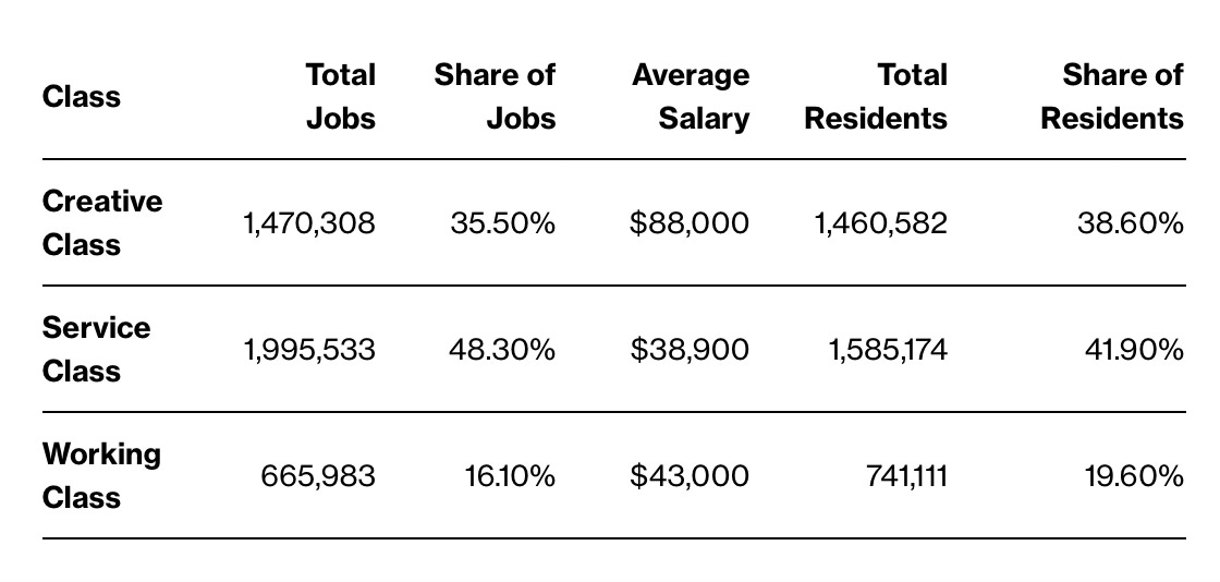 Unfortunately, the most influential social mapping that seems to have been applied to New York City is that advanced by Richard Florida, who divides the city’s population in functional terms along lines of occupation into the creative class, the service class and the working-class.