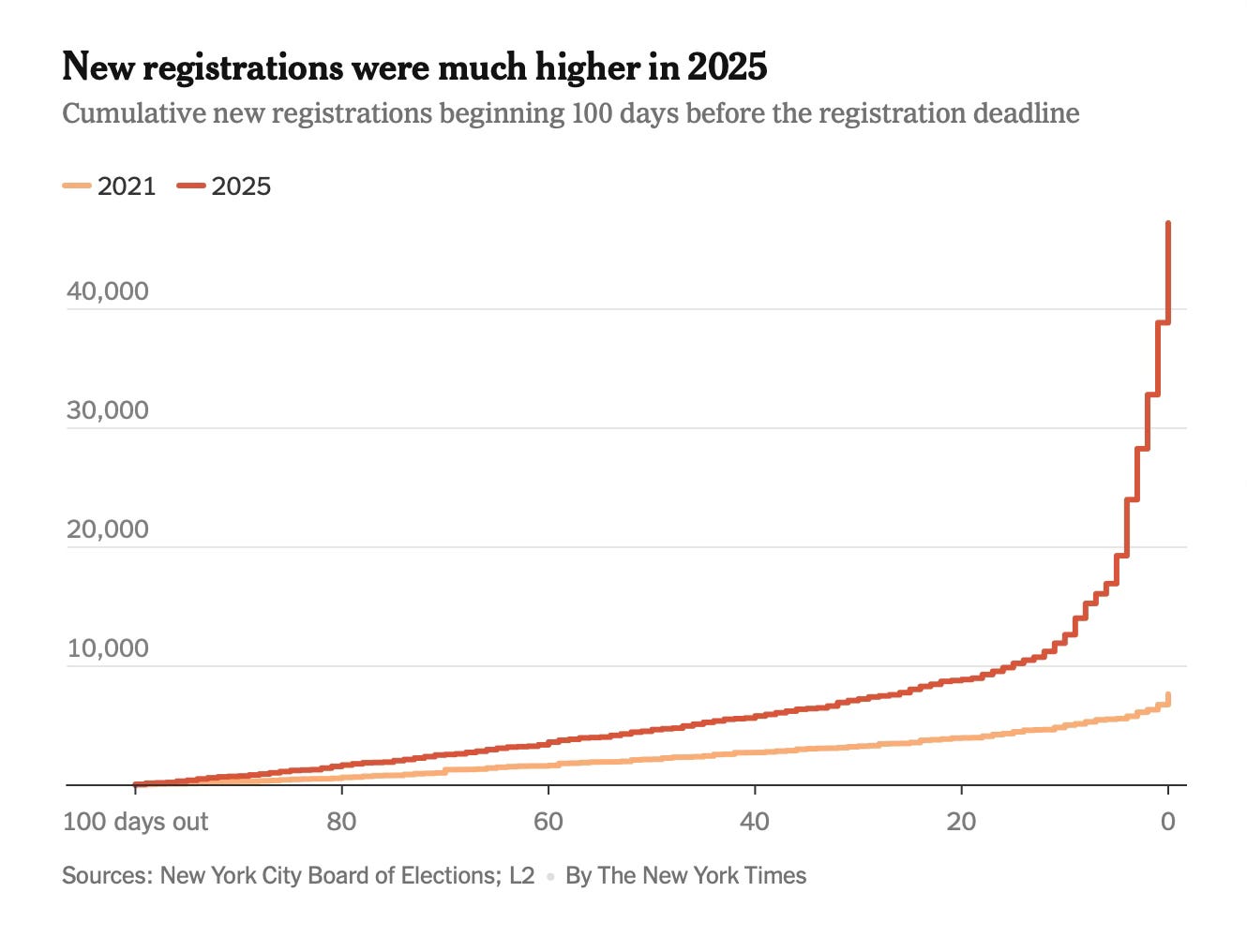 As By Emma G. FitzsimmonsAlex Lemonides and Irineo Cabreros show in The New York Times, registration of new voters surged close to Election Day, on a spectacular scale.