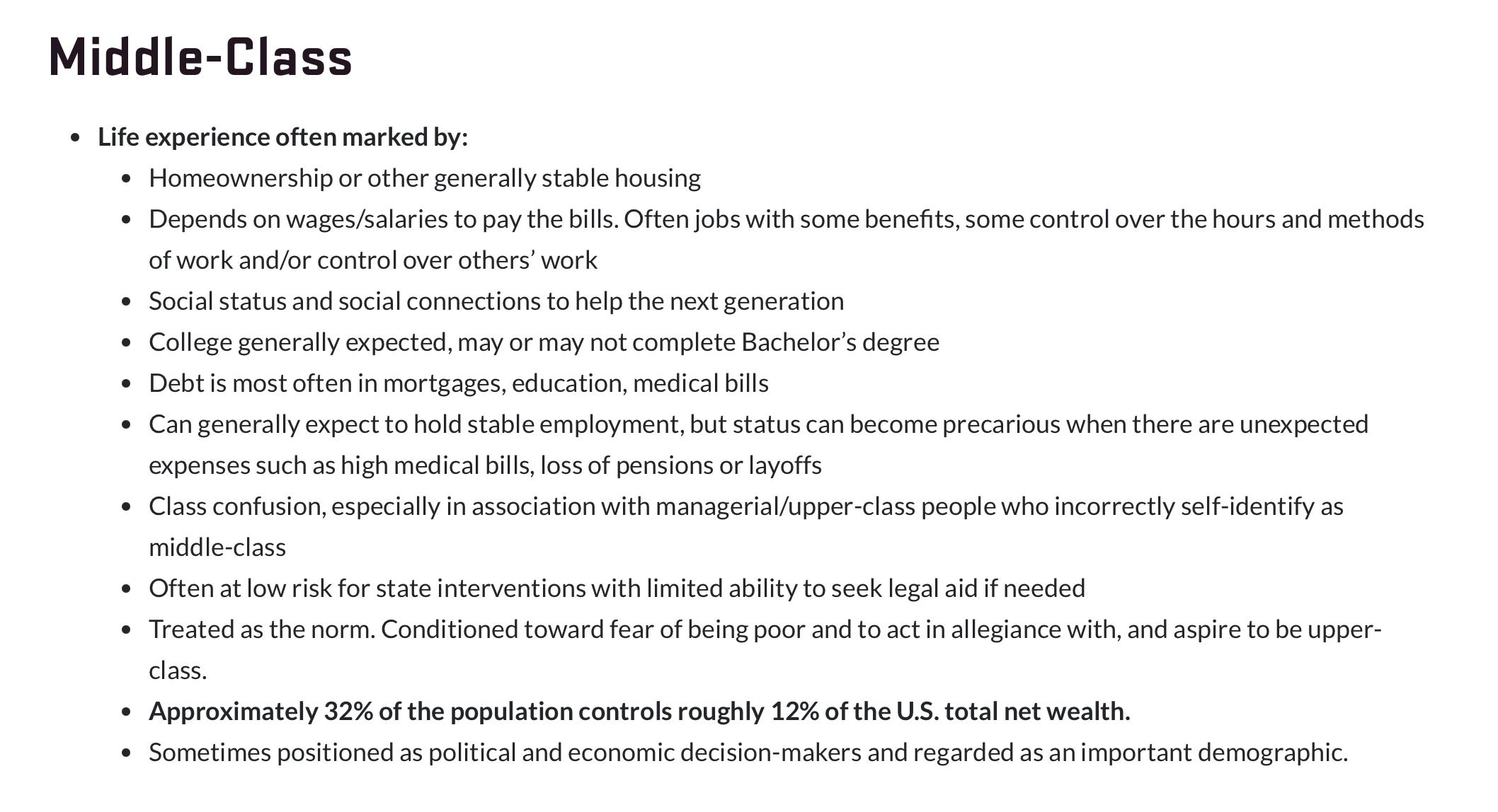 Start with the criteria for “the middle-class” developed by resourgeneration.org and ask: What does it mean to make a stable middle-class home in NYC? What does it mean to worry about bills, when your class position suggests that you should not be worrying? How heavy is the burden of debt or the risk of a major shock? What anxieties and fears pervade the question of child-rearing? And how does the hurdle of College figure in that equation? What does it mean to be associated with but also misidentified with the Professional Managerial Class? How are you positioned both with regard to those “above” and “below” you in the social hierarchy? How does all of this make you rally to a candidate who, in contemporary America, embraces the identity of democratic socialism?