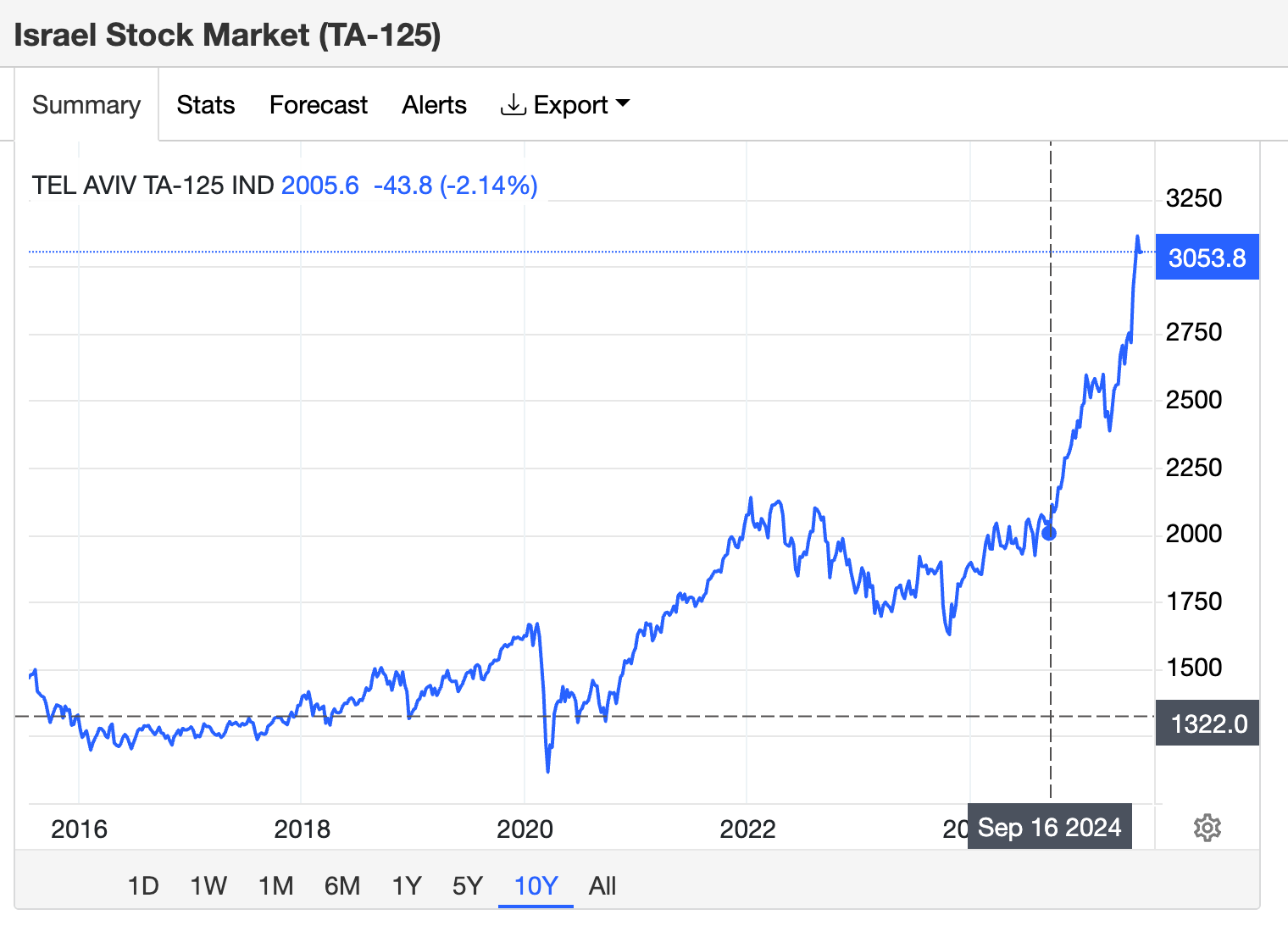 It is the success of Israel’s regional wars, which explains the scale and timing of the stock market boom. And it is indeed impressive. But pause for a moment to consider the logic.