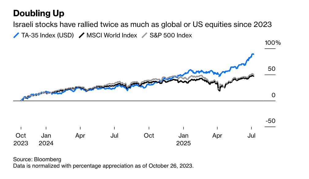 If you had bought the Israeli stock index on October 7 2023 you would have made more money than in any stock market in the world. Since the Hamas attack, as Israel has reduced Gaza to rubble, the Tel-Aviv stock market has surged. Within four weeks of the attack, the markets rebounded. As of July 2025, with international money flooding in, the index is up 80 percent in dollar terms.