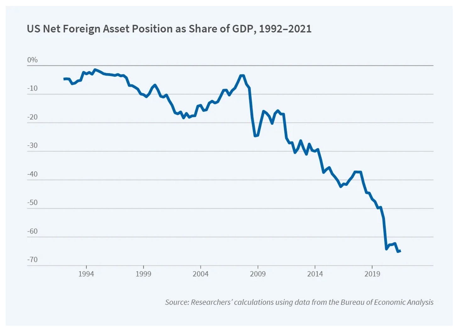 But a simple explanation in those terms is belied by the chronology of the imbalance. Though America has a long-standing tendency to accumulate liabilities to the rest of the world, it is since the 2010s that the net foreign asset position has lurched massively into the negative. Though the US has run huge current trade deficits in this period, the net foreign asset position has deteriorated by far more than one would expect on that basis.