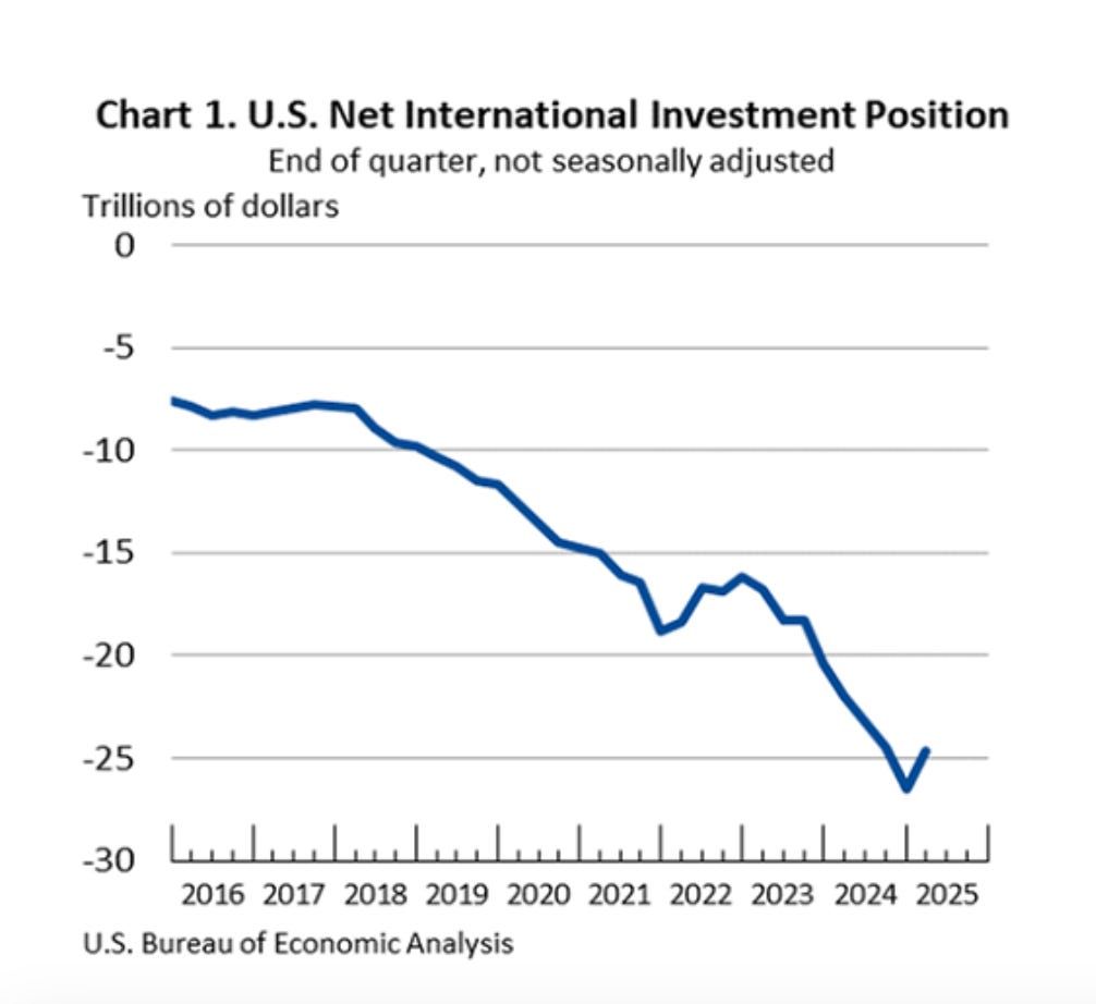 In the first quarter of 2025, according to data recently released by US BEA, America’s net international investment position currently stands at negative $24.61 trillion i.e. US liabilities to foreigners exceed US claims on the rest of the world to the tune of 90 percent of US GDP.