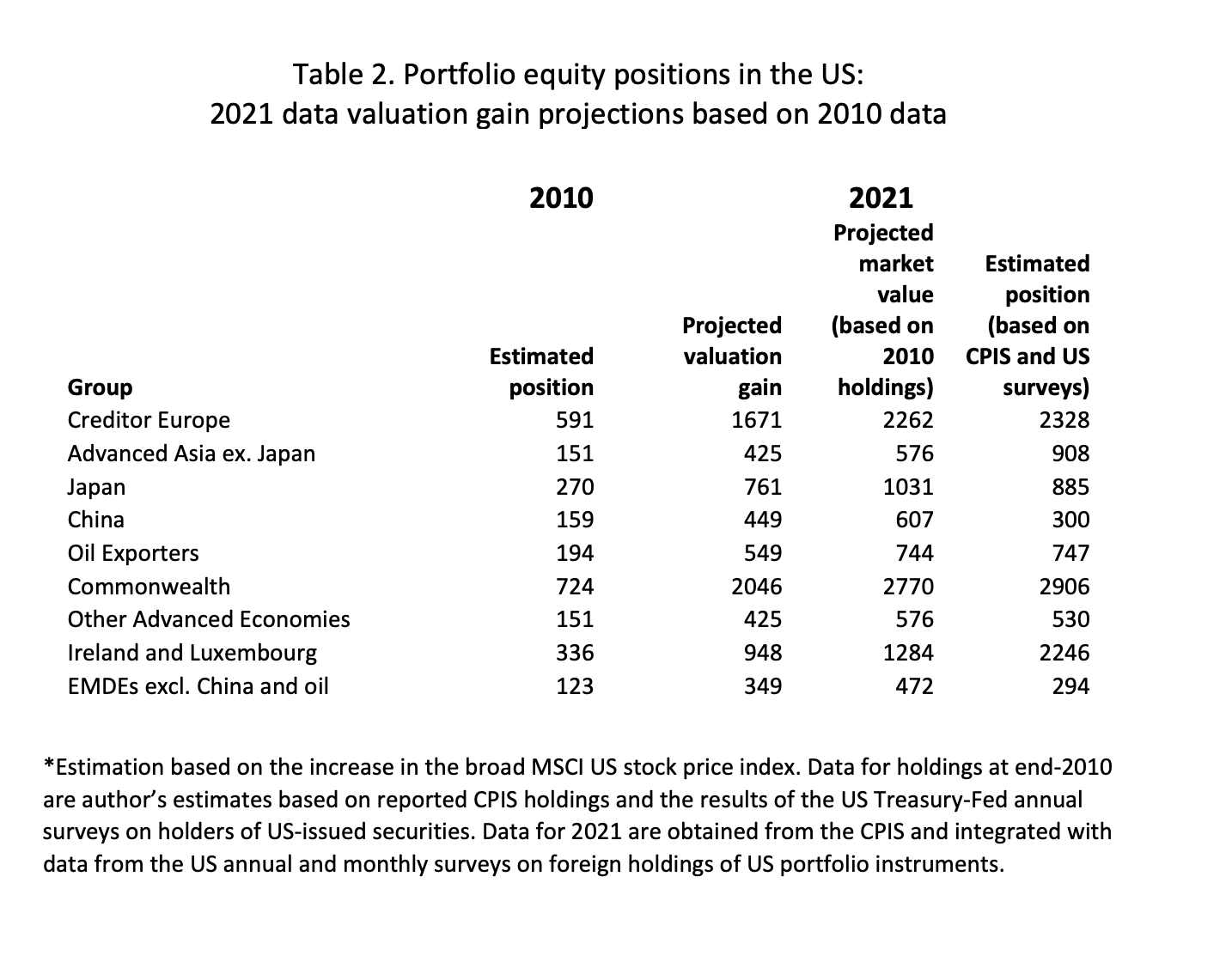 Theirs is a story centered on the interaction between capital flows, exchange rate and the manufacturing trade balance, not the net international investment position, which was propped up in the 2000s by high returns from US investments abroad. Since the 2010s that balance has broken down. As far as equity markets are concerned, the world entered a stage of “American exceptionalism”. Who were the principal foreign beneficiaries of this lop-sided era of American growth?