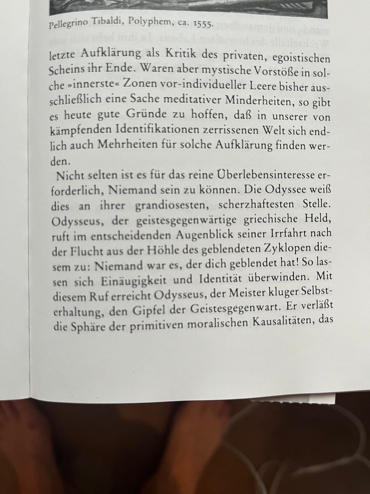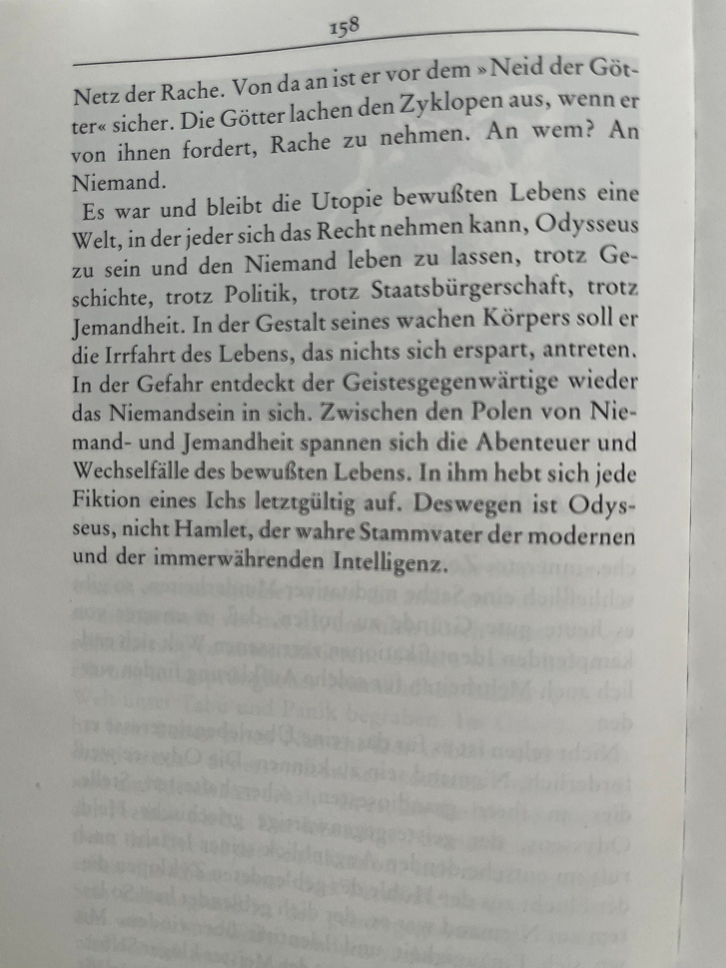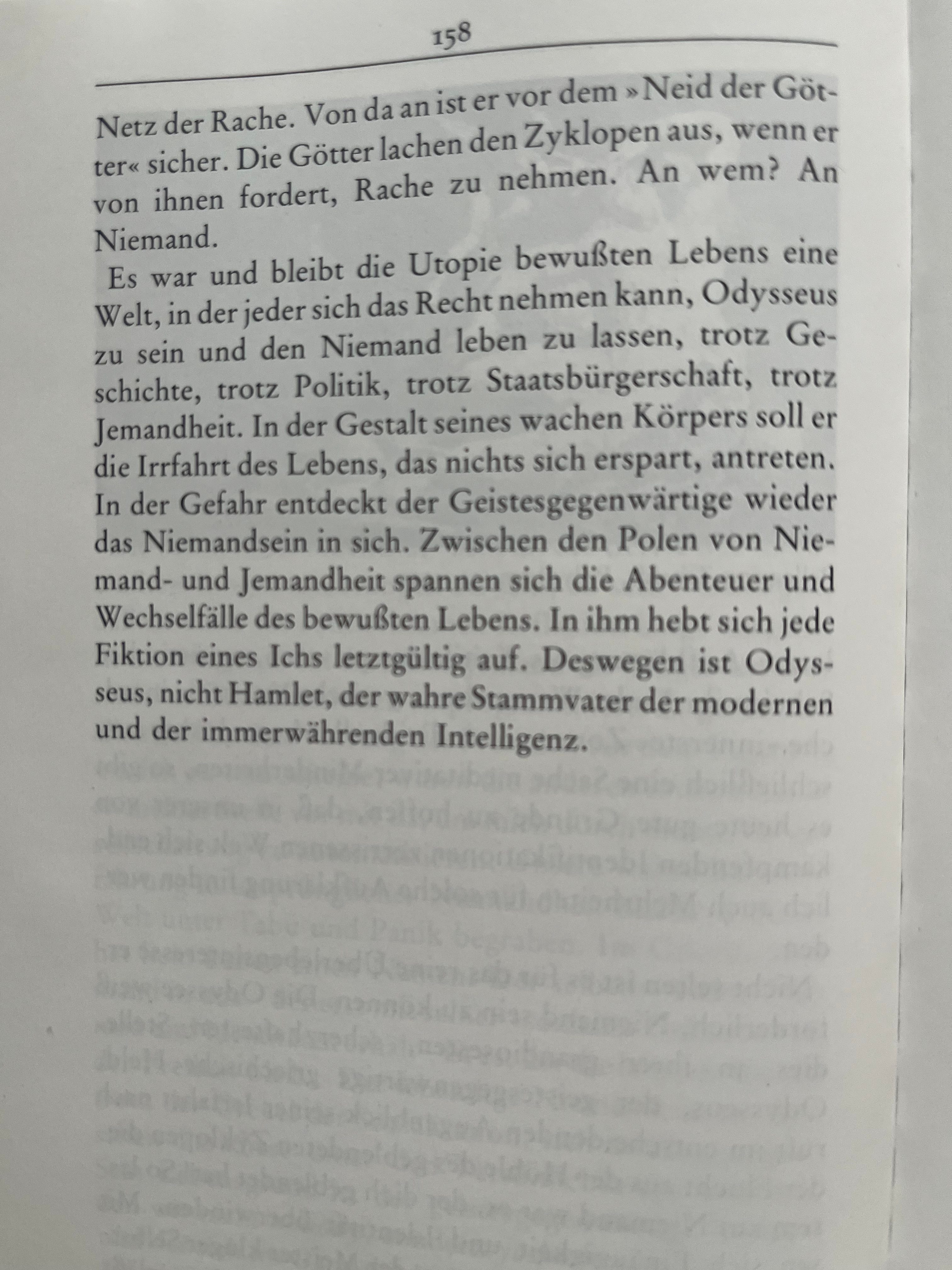 It was and remains the **utopia of conscious life**: a world in which everyone may claim the right to be Odysseus and let the *Nobody* live—despite history, despite politics, despite citizenship, despite *somebody-ness*. In the form of his wakeful body, he shall embark on life’s wandering journey, which spares itself nothing. In the moment of danger, the person who is **mentally present** rediscovers the *being-Nobody* within themselves. Between the poles of *Nobody-ness* and *somebody-ness* unfold the adventures and vicissitudes of conscious life. In this conscious life, every fiction of an "I" is ultimately dissolved. This is why **Odysseus—not Hamlet—is the true archetype of modern and perpetual intelligence.**”