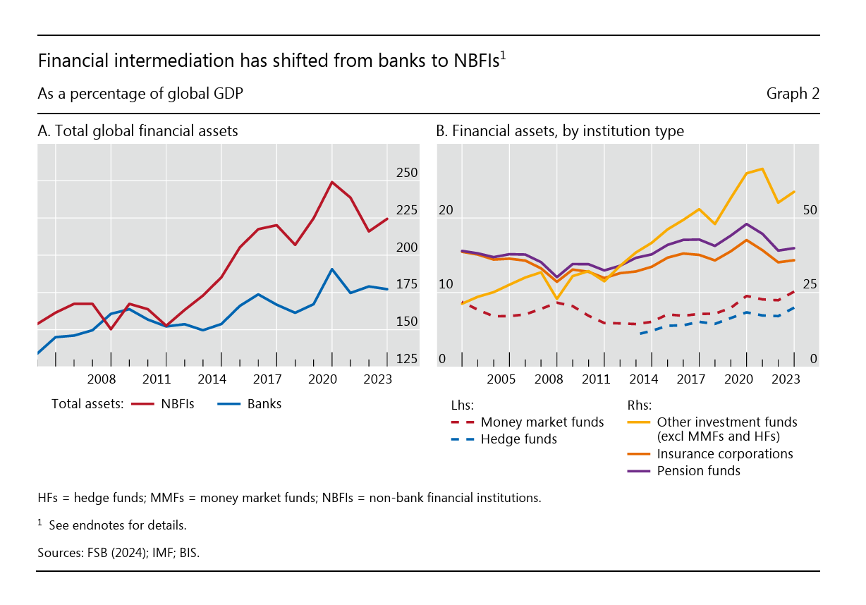 As the BIS remarks, investment funds, hedge funds and private credit markets have all expanded spectacularly. “Private credit funds’ assets under management have surged from $0.2 billion in the early 2000s to over $2.5 trillion in 2024.”