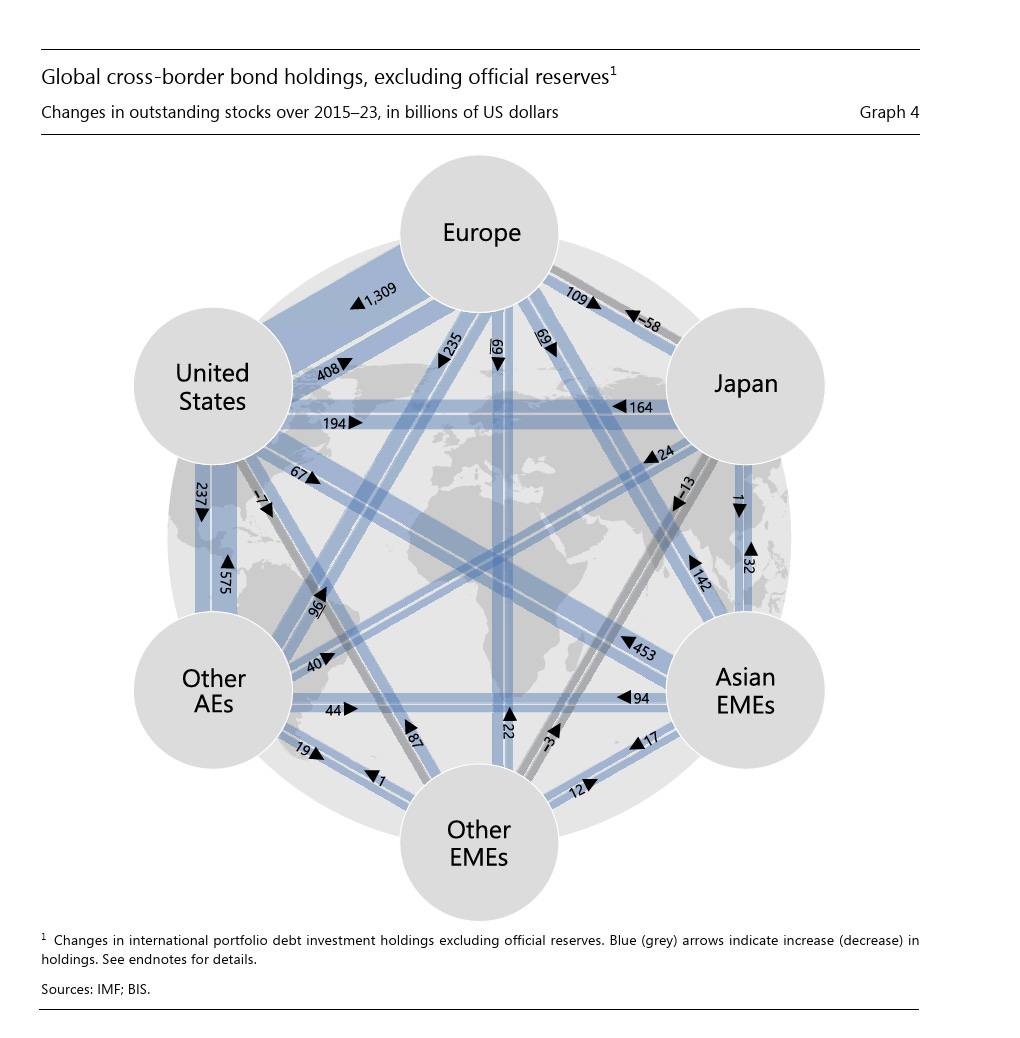 Net lending to the US in the form of bond purchases by European and other Advanced Economy increased between 2015 and 2023 by $ 1.2 trillion, which is three times more than the increase in claims by Asian Emerging Economies on the US over the same period. This is very much in line with the argument made in Chartbook 397 on the new pillars of the dollar system and the “dollar trap”. In that newsletter I was interested in the evolving geoeconomic logic of the dollar system. The BIS report allows us to think through the implications for the operation of the financial system.