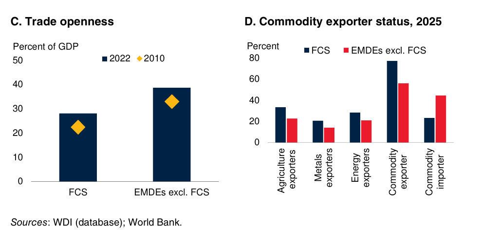 Without infrastructure and capital accumulation, embattled low-income countries are either shut out from global trade altogether or inserted into structurally inferior positions as commodity exporters. Whilst they export commodities that are essential to global production, FCS themselves are in no position to buy-in commodities, raw materials, or energy to feed their own economies.