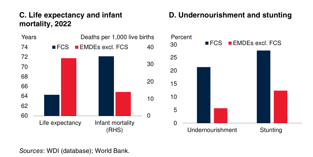 Food is the most basic necessity and amidst poverty survival dictates prioritizing food. But in conflict situations even that is no longer possible. Eighty-percent of those rated food insecure worldwide are in the FCS. The physical consequences are immediately obvious in figures for infant mortality, undernourishment, stunting and life expectancy.