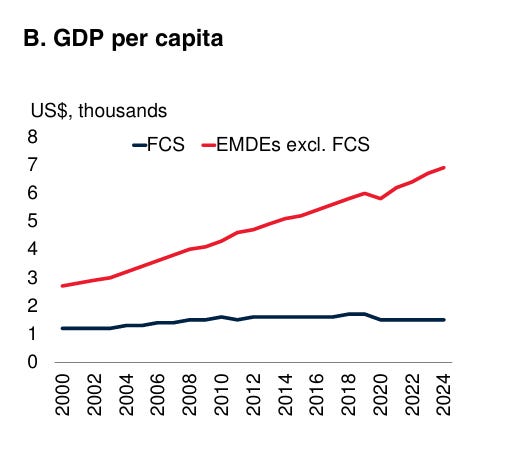 Whereas, since 2000, per capita GDP in emerging markets and developing economies has grown considerably, the same is not true for FCS.