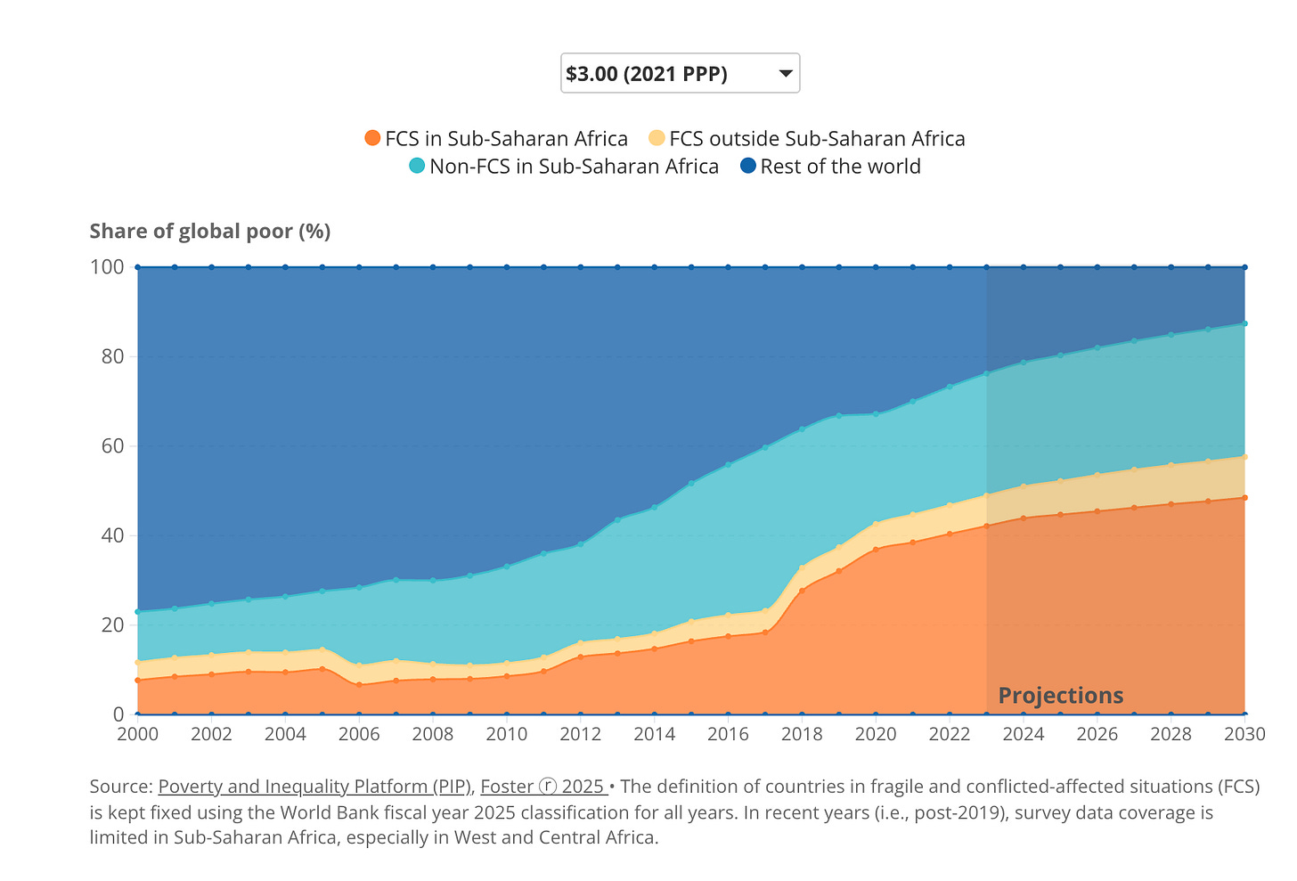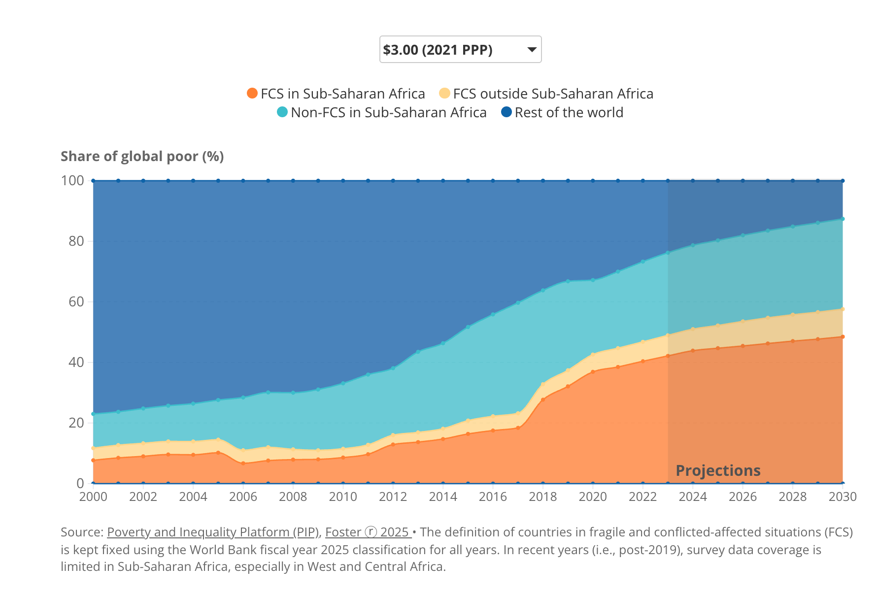 Above all those fragile and conflict-affected states are to be found in Sub-Saharan Africa. In 2023 42 percent of all absolute poverty worldwide was concentrated in that subset of states.