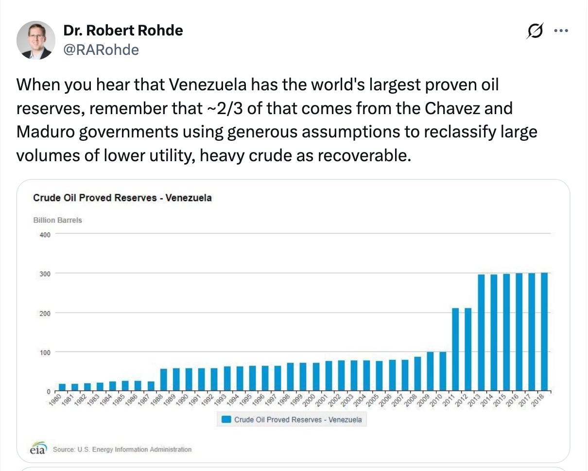 There has been lots of talk about the current situation in Venezuela and what it could mean for global oil markets, so I just wanted to provide some nuance on this When people say “Venezuela has the world’s largest oil reserves,” as you undoubtedly have seen being thrown around a lot on here, they are technically referring to a specific accounting definition, not to a stock of easy, cheap barrels ready to flood the market. To unpack that, you need to get into what those reserves are, how they behave in the subsurface, what it costs to turn them into marketable liquids, and how price, technology, and above-ground risk interact. That’s a lot to cover, but let’s give it my best shot. On paper, Venezuela has roughly 300–303 billion barrels of proved reserves, about 17 % of the global total and slightly more than Saudi Arabia. The critical detail is that around three quarters of that booked volume is extra-heavy crude from the Orinoco Belt in eastern Venezuela. These are bitumen-like oils with API gravity typically in the 8–14° range, extremely viscous at reservoir conditions and with high sulfur and metals content. So the statement “largest reserves” is really “largest booked volumes of very challenging heavy and extra-heavy oil.” Technically recoverable versus economically recoverable is the first big distinction. The USGS has long estimated that the Orinoco Belt contains on the order of 900–1,400 billion barrels of heavy crude in place, with perhaps 380–650 billion barrels technically recoverable using existing technology. Venezuela and OPEC only book a subset of that as “proved,” but even those proved numbers are sensitive to the assumed oil price and development concept. When prices were strong in the 2005–2014 window, a large portion of Orinoco volumes became economic on paper and were reclassified as proved, driving the headline reserves from ~80 to ~300 billion barrels. Geology and fluid properties are the second big differentiator. Orinoco crudes are extra-heavy, with densities up around 934–1,050 kg/m³, high asphaltene content and sulfur on the order of 3–4 wt% or more, depending on the block. This is a completely different animal from a 33–40° API, low-sulfur Arab Light-style crude. In plain English, that means it’s much harder to handle at various stages and each step adds capex, opex and energy use. In other words, the “barrel in the ground” in Venezuela is inherently worth less and depends on a narrower set of buyers. Surface systems and institutional capacity are another constraint. Before the 2000s, PDVSA had a reputation as a technically capable NOC. Since then, you have had a combination of mass layoffs and politicization, under-investment, sanctions, corruption and brain drain. The result is decayed gathering systems, chronic power shortages, refinery fires and upgrader downtime. Finally, integration with global refining and logistics matters for strategic value. Venezuela’s crude slate is optimized for complex “coking” refineries in the US Gulf Coast, parts of Asia and a few European plants. That’s a story for another time though, because the length of this analysis is getting out of hand. So when you hear that Venezuela has “the world’s largest oil reserves,” the technically accurate part is that the country has extremely large volumes of extra-heavy oil in place, and a big subset of that was once judged economically recoverable at high price assumptions and booked as proved. The more relevant questions for energy strategy are how many of those barrels are genuinely economic under realistic long-term prices, how quickly they can be brought onstream given infrastructure and institutional constraints, what netback they deliver at the refinery gate, and how exposed they are to being left in the ground if demand peaks. On those metrics, Venezuelan barrels sit much further out on the cost and risk curve than the headline “largest reserves” soundbite suggests.