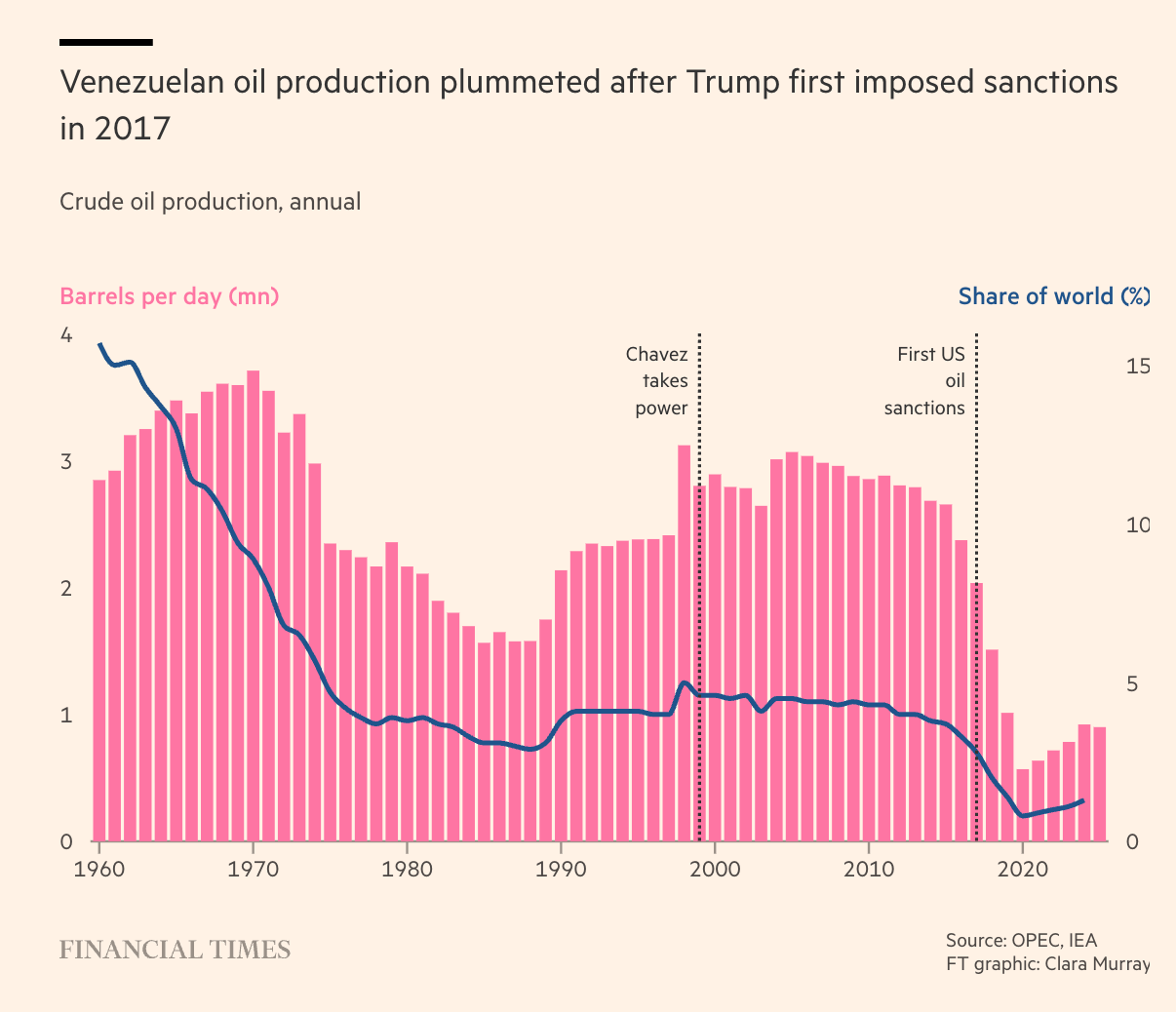 So what happened to the Venezuelan oil industry and when did it happen? Starting from this FT graph it would seem that this is a story in three parts. #1 The long decline in the 1970s. #2 The recovery of the 1990s leading to stabilization on a reasonably high plateau from the 2000s. #3 The collapse of the mid 2010s that began before but was massively amplified by sanctions applied under the first Trump administration in 2017.