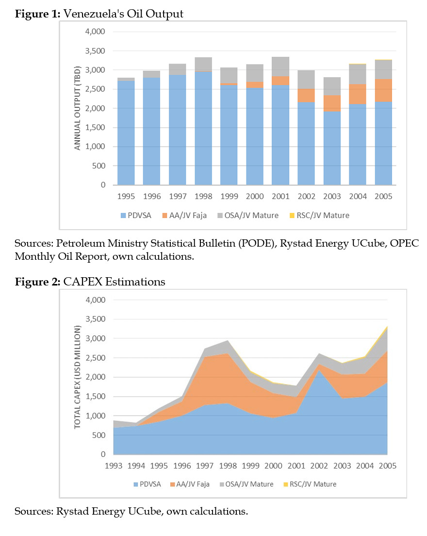 The Apertura was a great success. Almost all the major international oil companies in the world invested in Venezuela. BP, CNPC, Conoco, Chevron, ENI, Exxon, Petrobras, Repsol, Shell, Statoil, Total, among others, made significant investments. In 2005, combined output from OSAs and AAs reached an average of 1.1 MBD. Projects developed during Apertura added an output capacity of 1.2 MBD. Rystad Energy estimates the CAPEX provided by private investors at USD 10.8 billion. Manzano and Monaldi (2008) estimated that the total CAPEX on the Apertura projects at $25 billion.