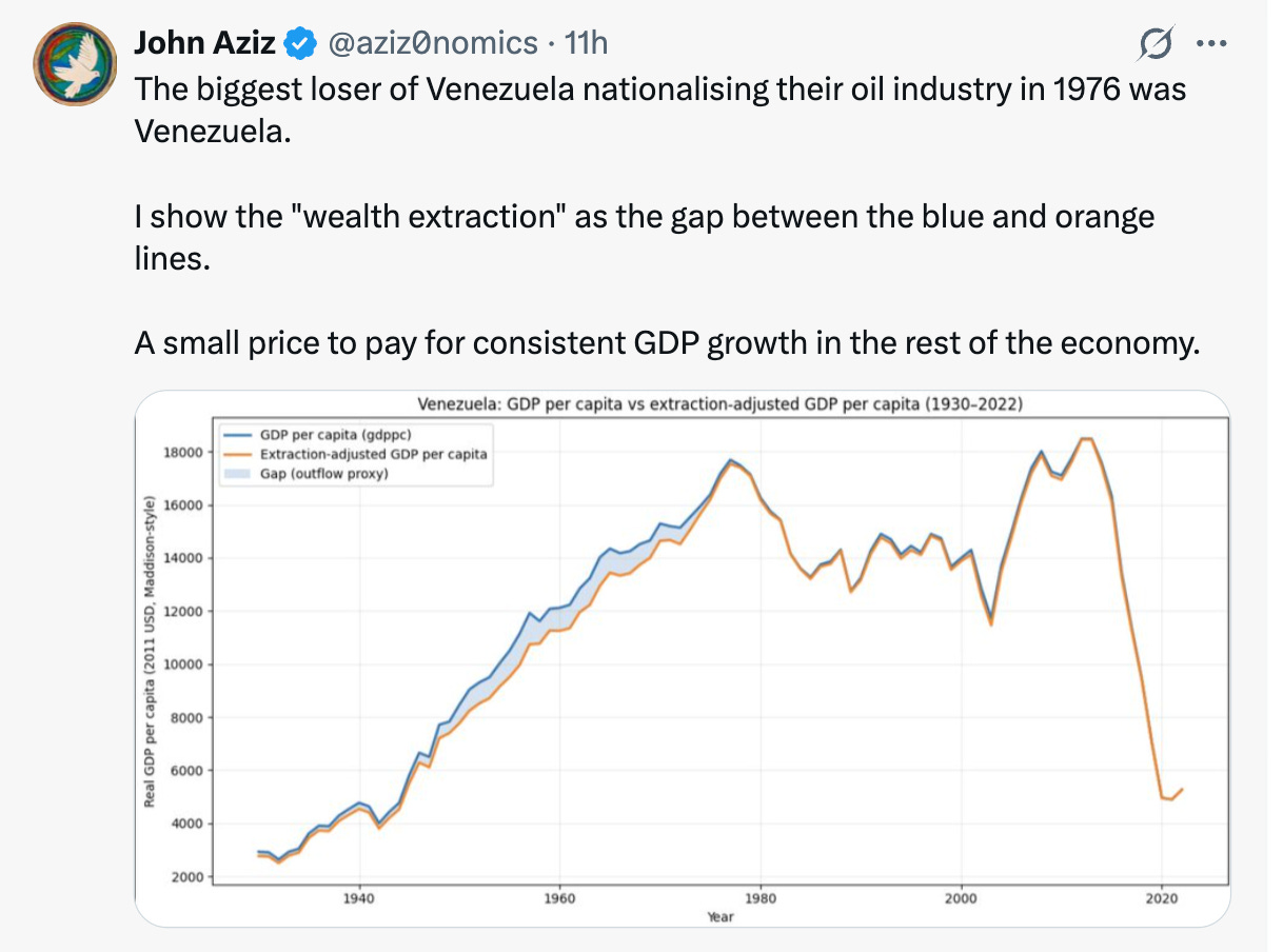 Even as far as Venezuela’s own situation is concerned, to evaluate claims about the relative merits of extractive regimes, one clearly wants an “extraction-adjusted GDP per capita” to get the full picture. And lo and behold, Twitter provides. And yes I am aware that every twitter account comes with its own politics. But this graph is excellent. Clearly, a high rent extraction regime was compatible, to say the least, with rapid economic development in Venezuela. (NOT saying anything about distributional issues, economic diversification etc etc).