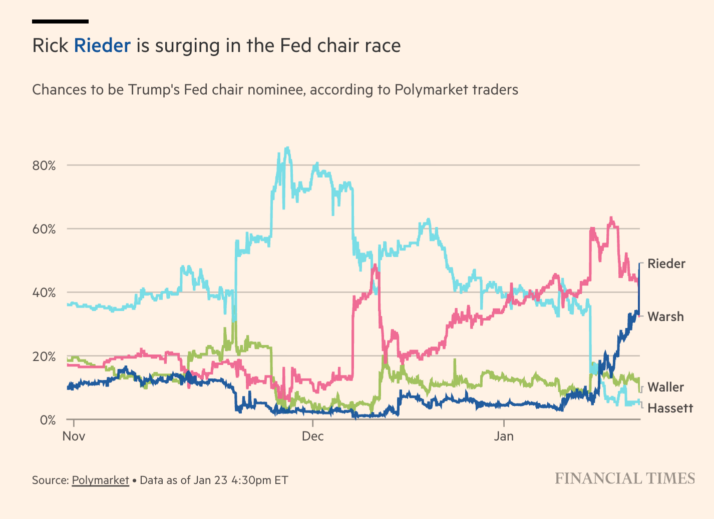 Treasury department officials have recently sounded out big bond investors about Rieder, and former Fed governor Kevin Warsh, seen as another strong contender for the job, said several people with knowledge of the matter. Treasury maintains regular contact with market participants, but the questions about Rieder have become more pointed recently, some of the people added. The Treasury did not immediately respond to a request for comment. Rieder, who as chief investment officer for global fixed income oversees BlackRock’s $2.4tn bond strategies, is a well-known markets veteran. He has been at the asset manager since BlackRock acquired his firm R3 Capital Partners in 2009. Before that he spent two decades at Lehman Brothers. White House economic adviser Kevin Hassett was long seen as the clear favourite to win Trump’s endorsement. But his odds have tumbled in recent weeks, after the FT reported big bond investors told the Treasury department that choosing a staunch ally of the president could unnerve markets and inflame worries over central bank independence. Bets on Hassett cooled further after it emerged earlier this month that the Department of Justice had opened a criminal probe into Powell’s testimony. The investigation triggered a backlash from former Fed chiefs, international central bankers and senior figures on Wall Street, including JPMorgan chief executive Jamie Dimon. The Fed has defended Powell’s testimony.