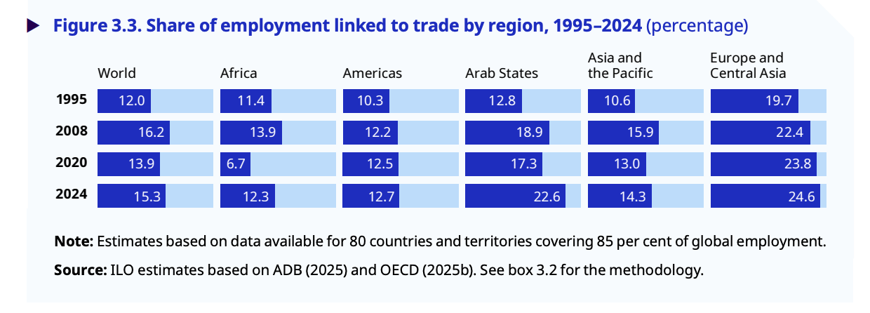 These staggering data come from the 2026 edition of the ILO’s Employment and Social Trends. They are an effect of overall size of the respective economies and their trade intensity. The Eurasian economy is huge and its trade share is higher than that of the Americas (which has a large economy) and Africa (with a large but very poor population). As the ILO explains:
