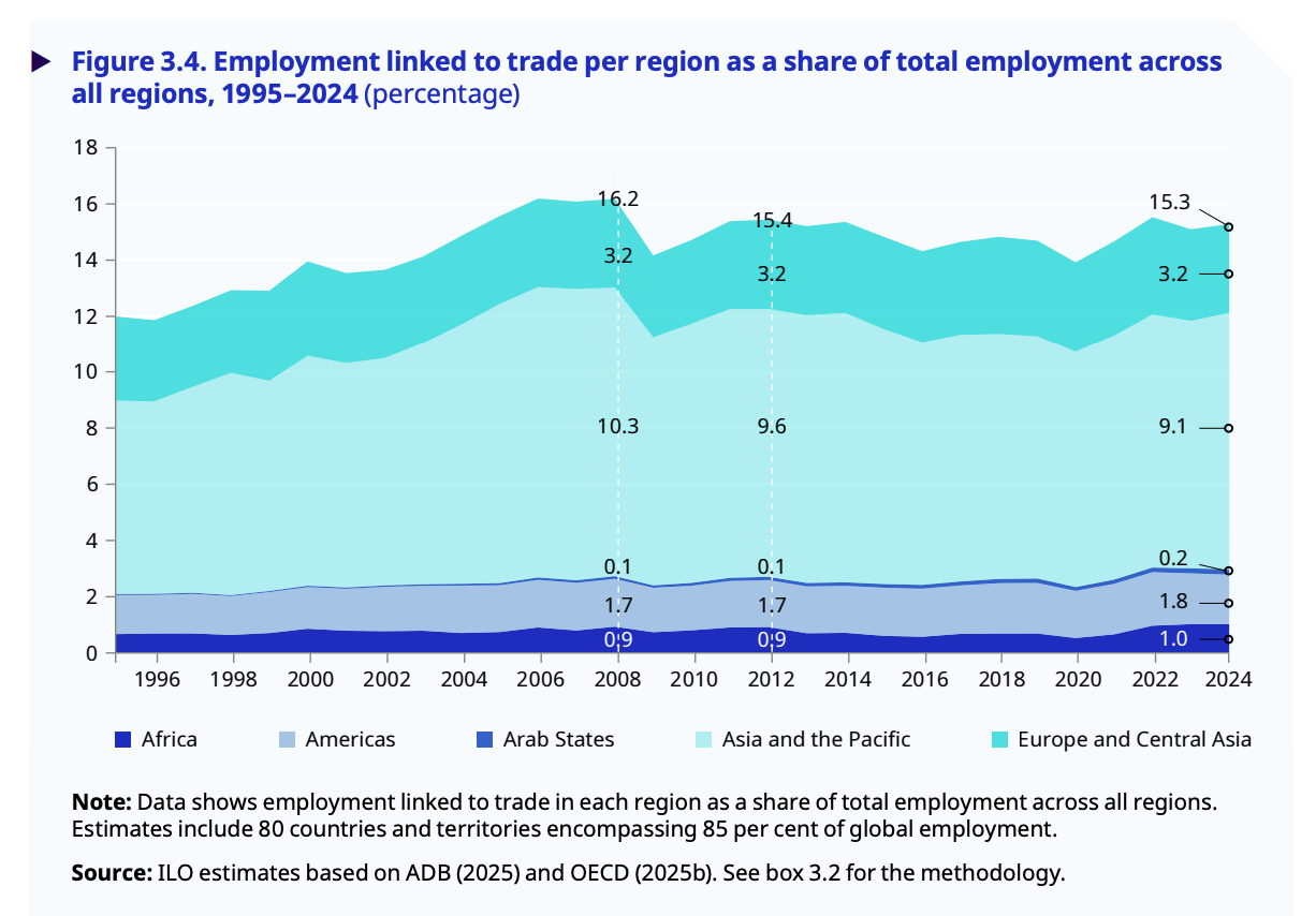 In the 80 countries and territories with available data, 465 million jobs were linked to the global trade in goods and services in 2024, representing 15.3 per cent of total employment (see figure 3.3).2 Employment linked to trade includes all activities that directly or indirectly, through supply chains, meet foreign demand. Its regional distribution largely reflects the size of the labour force. Asia and the Pacific accounts for more than half of these jobs (278 million), followed by Europe and Central Asia with 96 million. The share of employment linked to trade within regions varies from 12.3 per cent in Africa to 24.6 per cent in Europe and Central Asia. Within Asia and the Pacific, the subregion of South-Eastern Asia stands out with 24.1 per cent of its employment linked to trade.