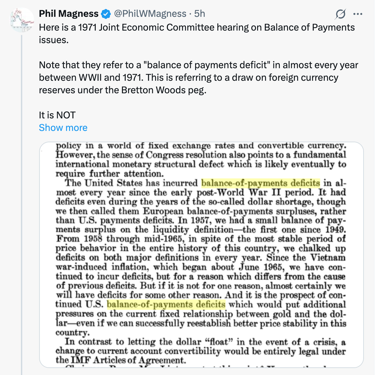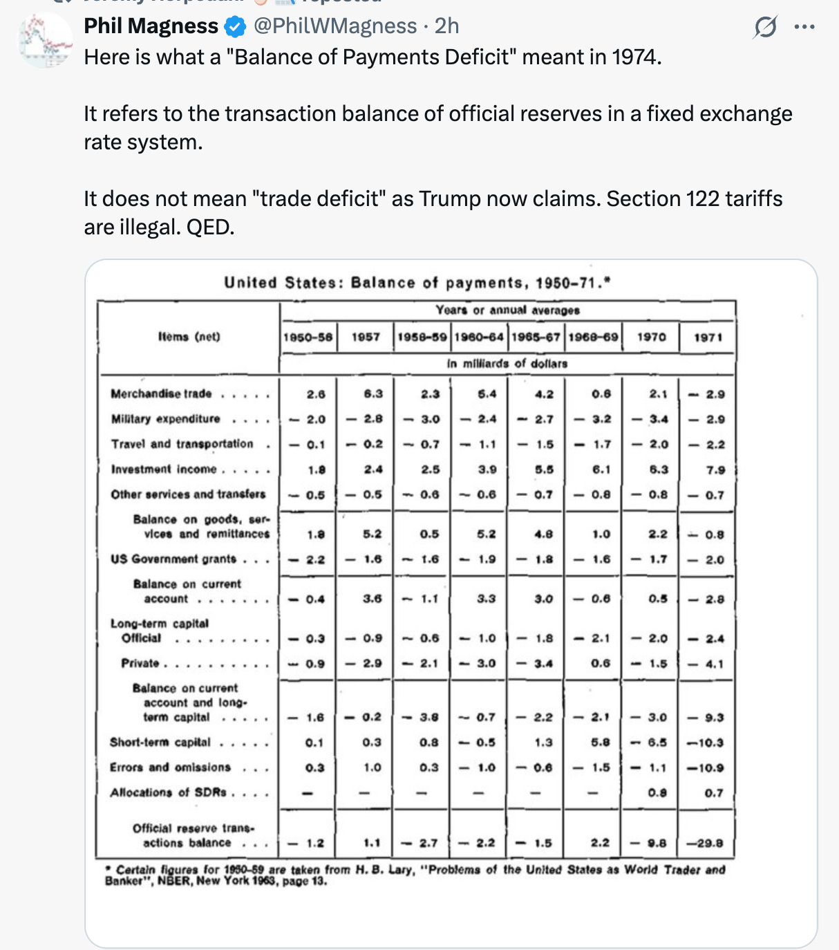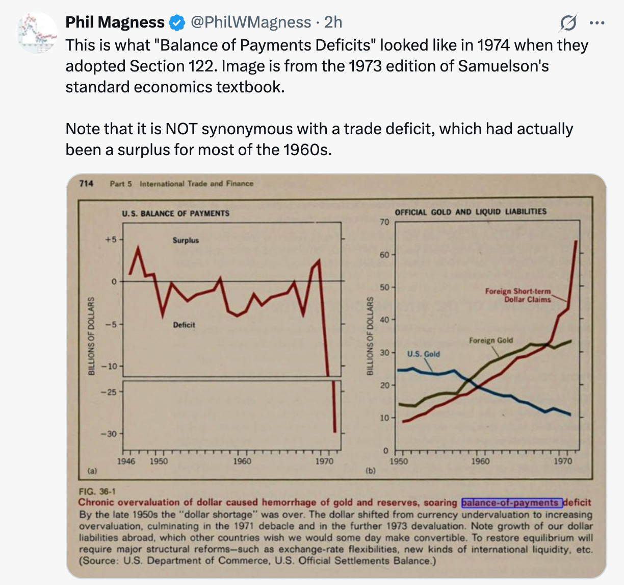 This is a great tweet from Phil Magness arguing strongly that the invocation of the 1974 law makes no sense because the balance of payments of the Bretton Woods era was different.