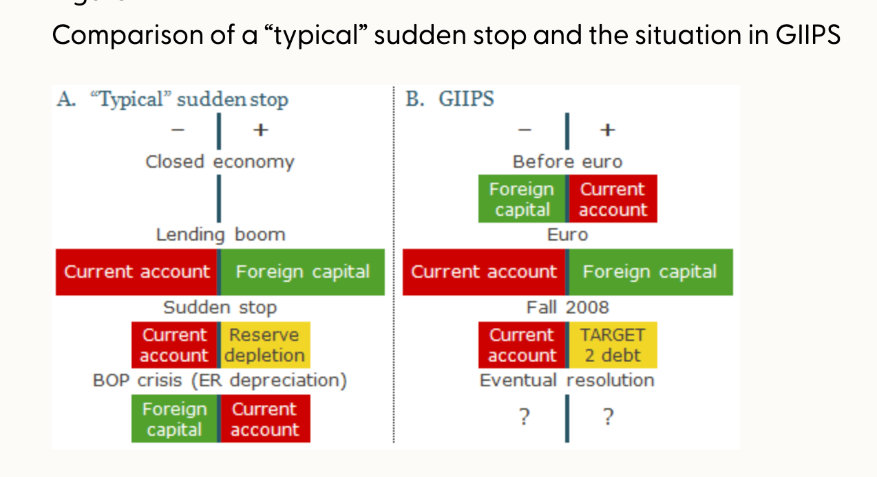 This is from a San Francisco Fed presentation on “sudden stops”. See how the graphic on the right starts with “closed economy” followed by an “opening up”. The reserve depletion moment comes during the adjustment shock. The balance of payments balances throughout this story, but during the sudden stop phase it is stressed.