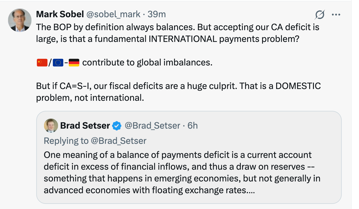 But if we grant that the balance of payments is disequilibreated, then the next question is why? Is America’s deficit really an “international” one. Or is it a matter of national economic balance? Here comes Mark Sobel with four decades at the US Treasury to make the point: