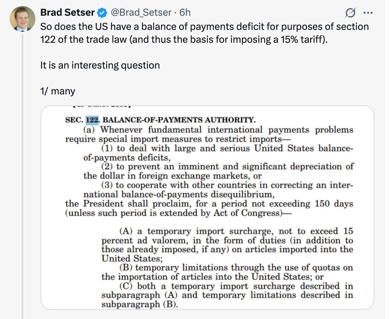 Anyway, this 1974 law seemingly gives the President the right to impose tariffs of up to 15 percent for up to 150 days under the so-called Sec 122. “Balance-of-Payments authority”.