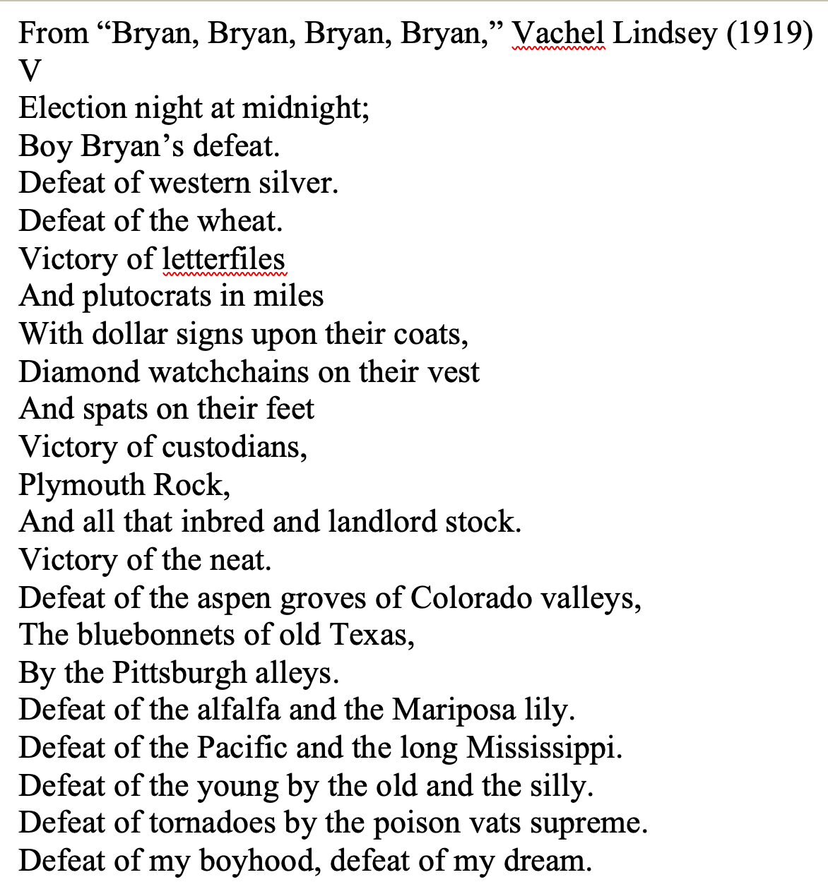 On Vachel Lindsey’s peculiar poetic and political persona see the Poetry Foundation.