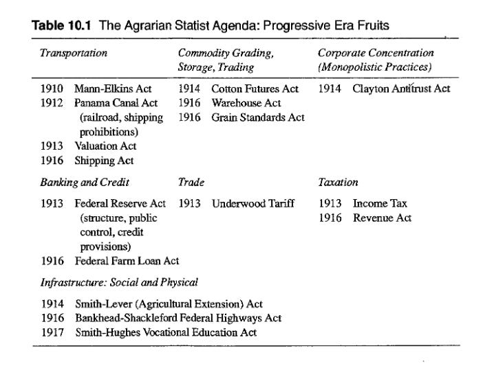 For Sanders the remarkable range of statist measures enacted between 1910 and 1916, often associated with the “New Freedom” agenda, crafted for Woodrow Wilson by Louis Brandeis, was, in fact, in large part the work of Congressional populists. Bryan himself served in Wilson’s administration as Secretary of State, pursuing an agenda of international conciliation in a vain effort to prevent the outbreak of World War I. At home, Wilson’s progressive agenda was in large part the fruit of the agrarian mobilization.