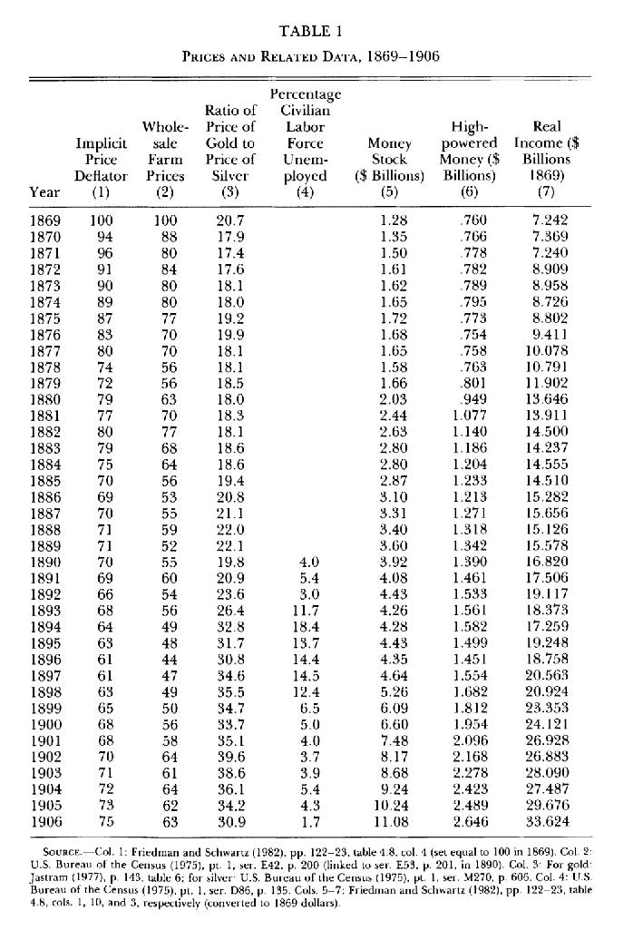 The ultimate reasons for this deflation are complex and disputed. What the populists challenged was the decision to end the monetary chaos of the civil war era in the 1860s by returning to gold, a move completed in 1879. Specifically, what they contested was the Coinage Act of 1873 that ended the right to have silver minted into coin. As Rockoff remarks: “Between 1869 and 1879 the stock of money grew at about 2.6 percent per year and real output at about 5.0 percent per year, so the deflationary pressure from the lack of monetary growth is easy to understand.”
