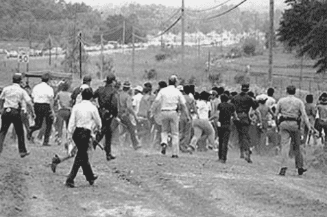 The option preferred by the Clintons was to screen the Cubans on an aircraft carrier and to deport the unwanted back to the US base of Guantanamo. In Arkansas, Clinton warned Carter, he was struggling to prevent “a bloodbath that would make the Little Rock Central High crisis look like a Sunday afternoon picnic.” Clinton feared that he did not have the police resources necessary to prevent murderous clashes between protesting Cubans and heavily armed Arkansas locals (visible on the road in the background of this image).